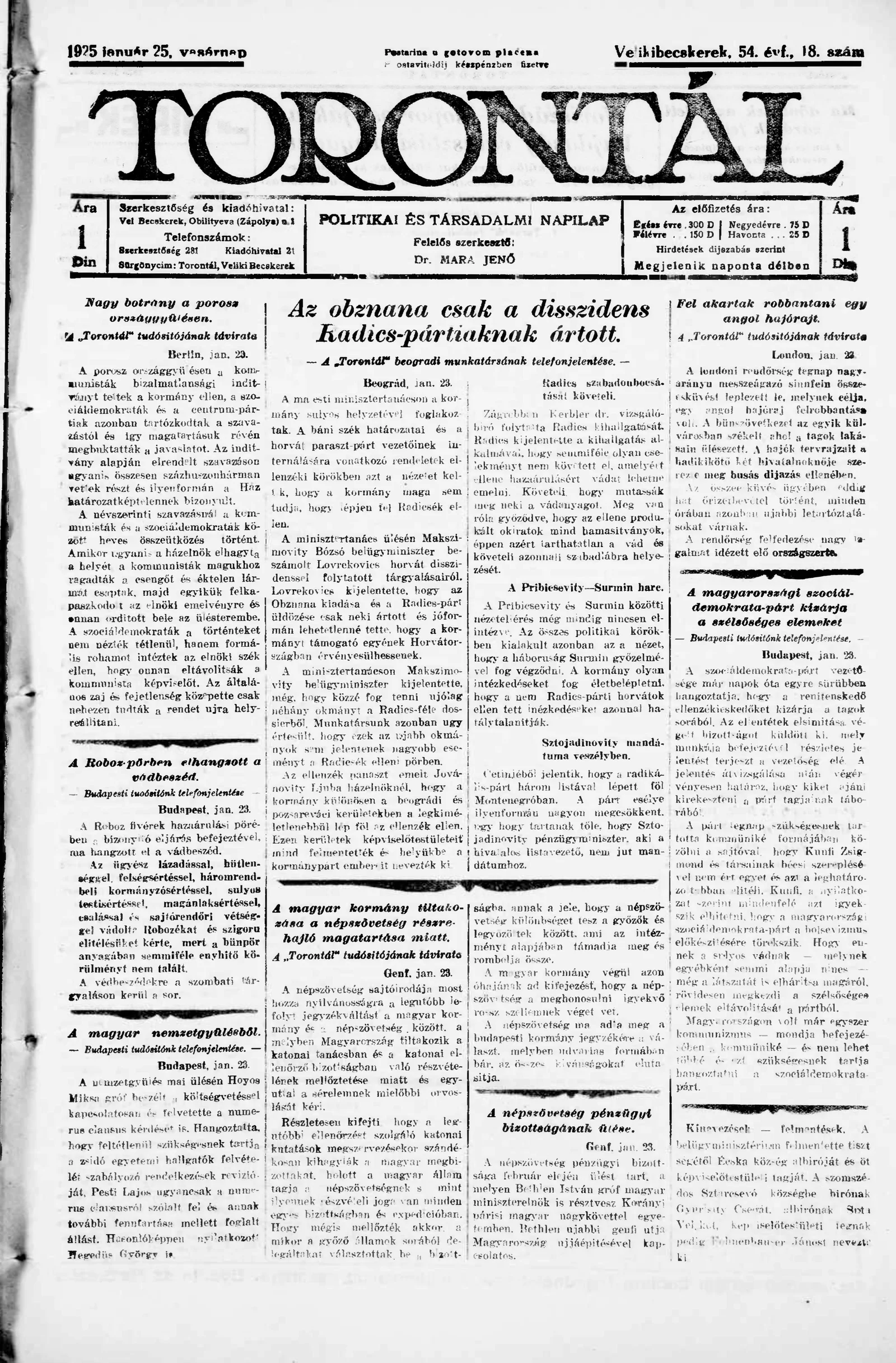 Torontál, 54. évf. 1925. január 25. 18. sz.