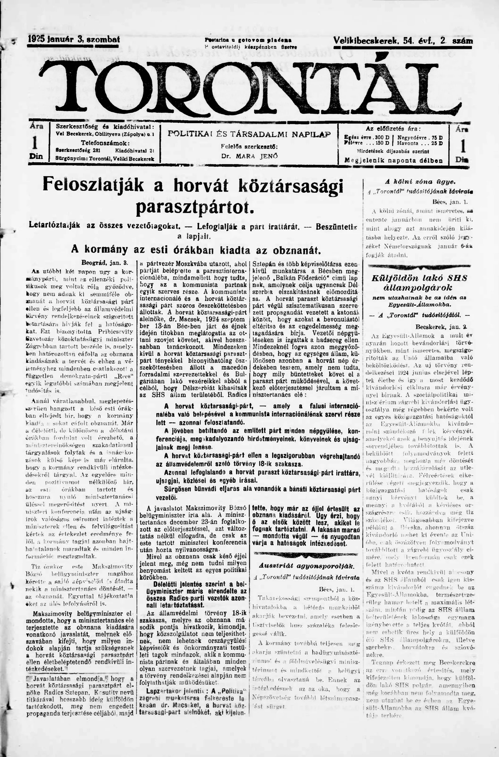 Torontál, 54. évf. 1925. január 3. 2. sz.