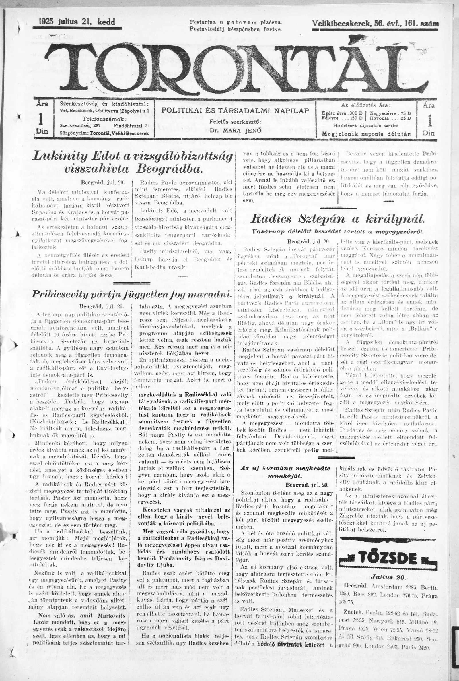 Torontál, 54. évf. 1925. július 21. 161. sz.