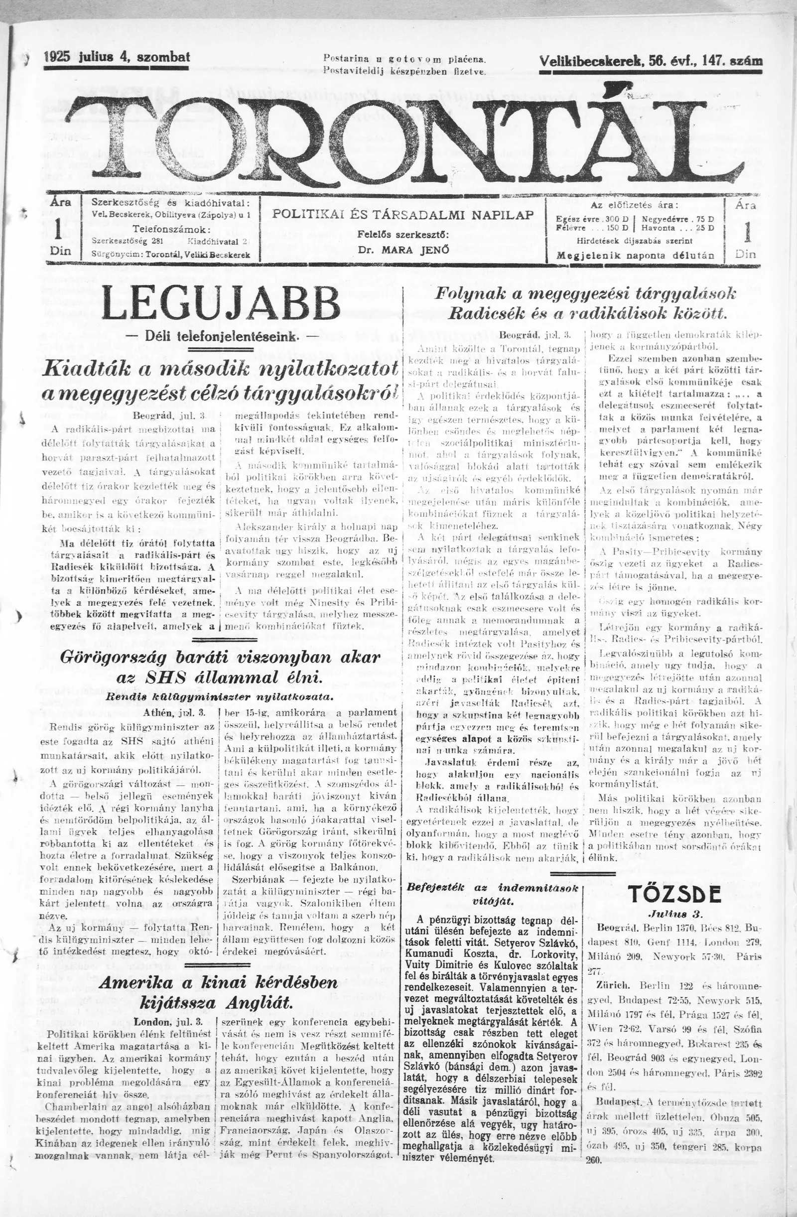 Torontál, 54. évf. 1925. július 4. 147. sz.