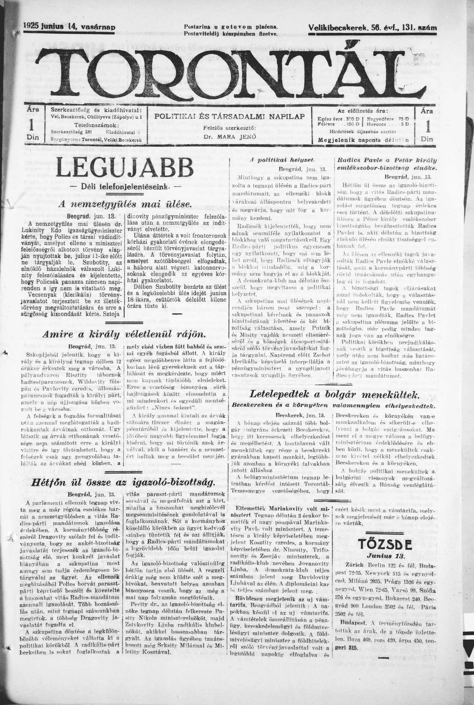 Torontál, 54. évf. 1925. június 14. 131. sz.