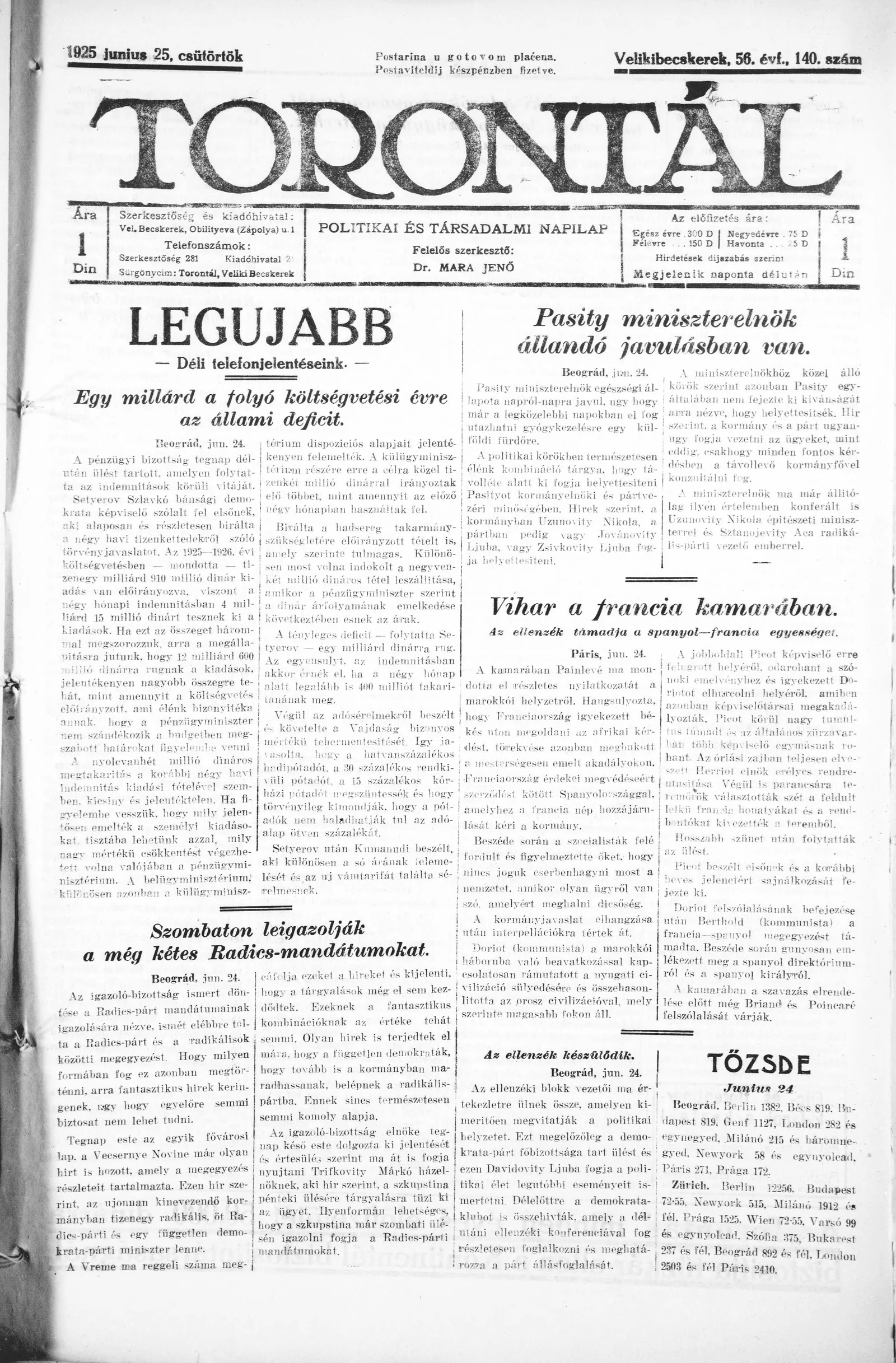 Torontál, 54. évf. 1925. június 25. 140. sz.