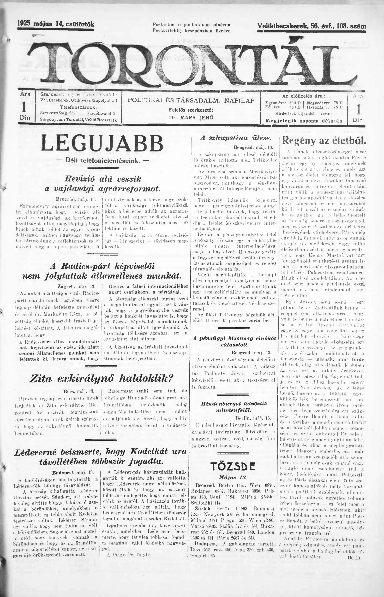 Torontál, 54. évf. 1925. május 14. 108. sz.