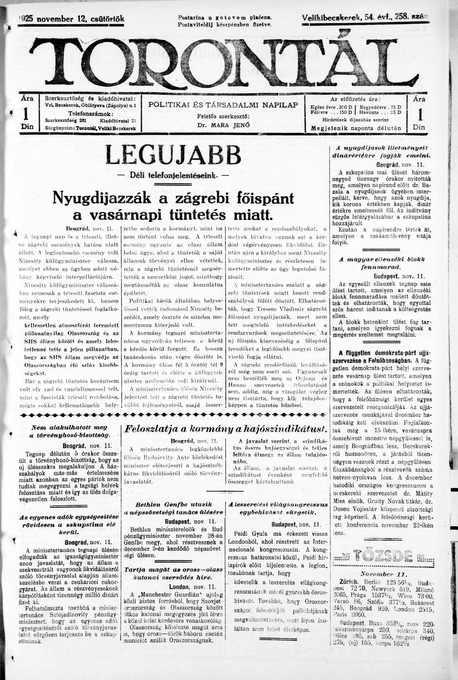 Torontál, 54. évf. 1925. november 12. 258. sz.