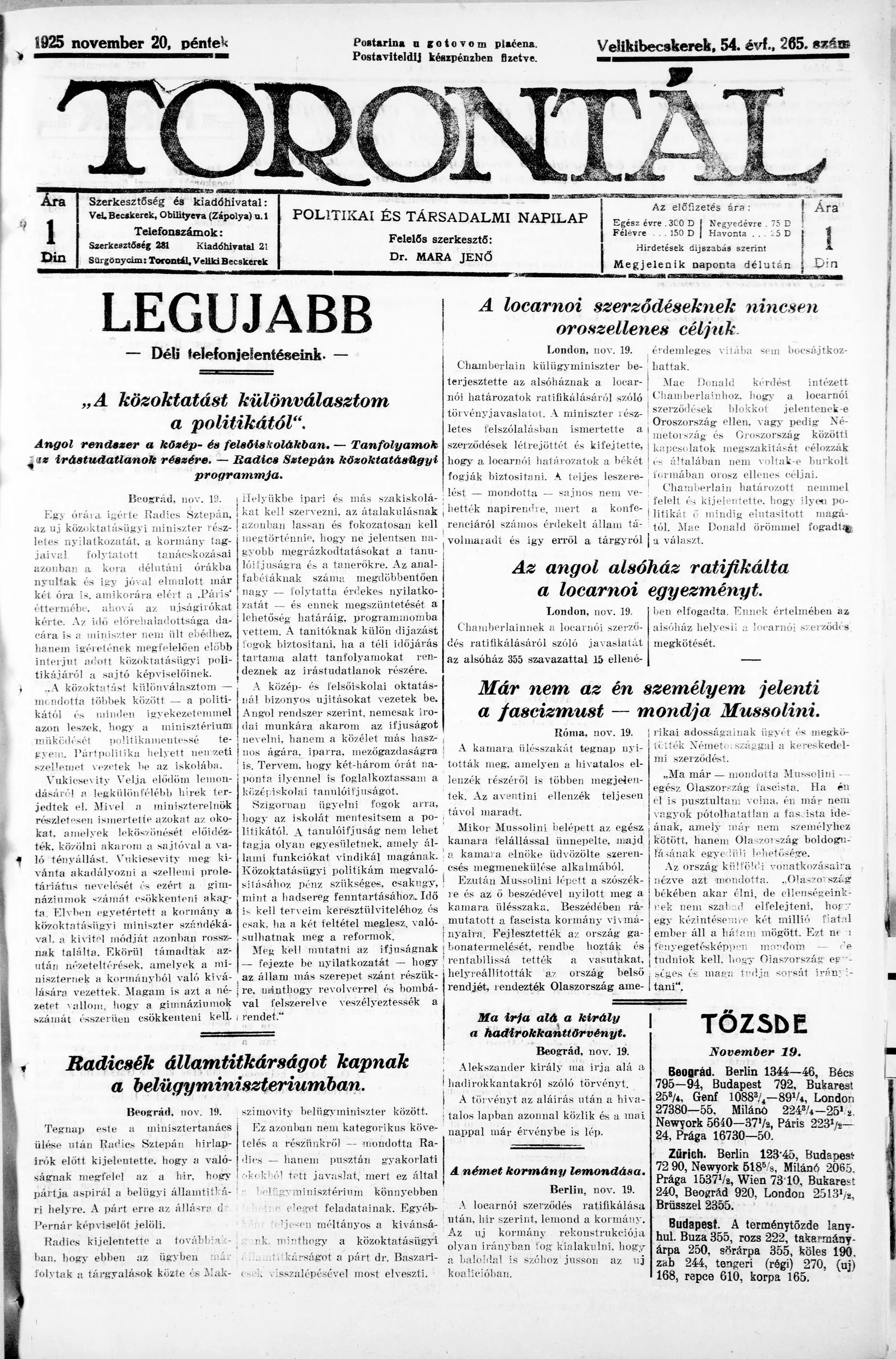 Torontál, 54. évf. 1925. november 20. 265. sz.