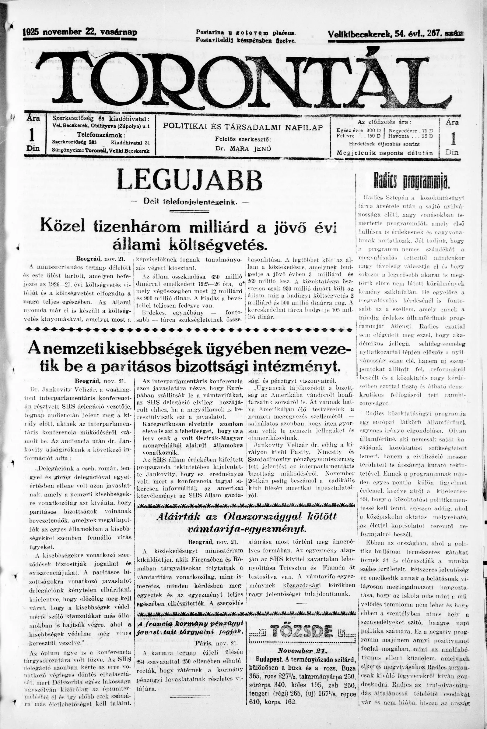Torontál, 54. évf. 1925. november 22. 267. sz.