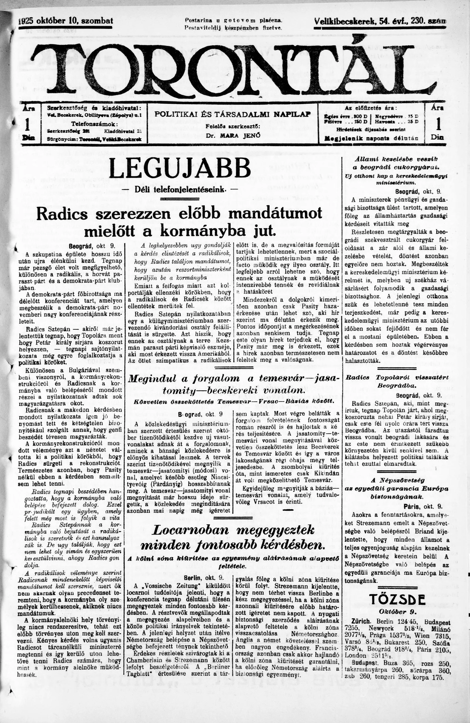 Torontál, 54. évf. 1925. október 10. 230. sz.