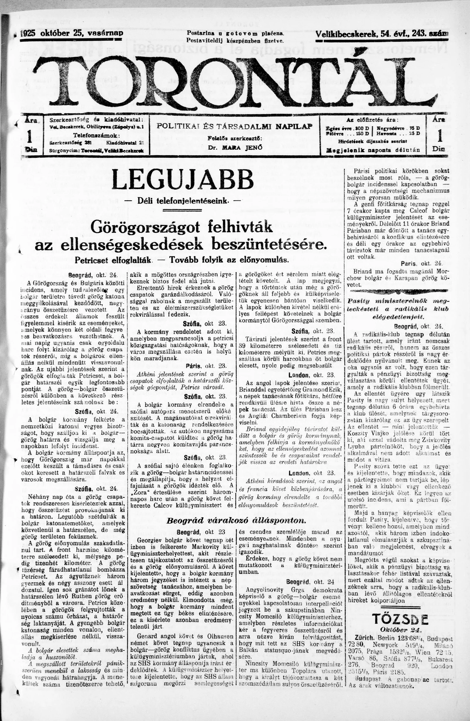 Torontál, 54. évf. 1925. október 25. 243. sz.