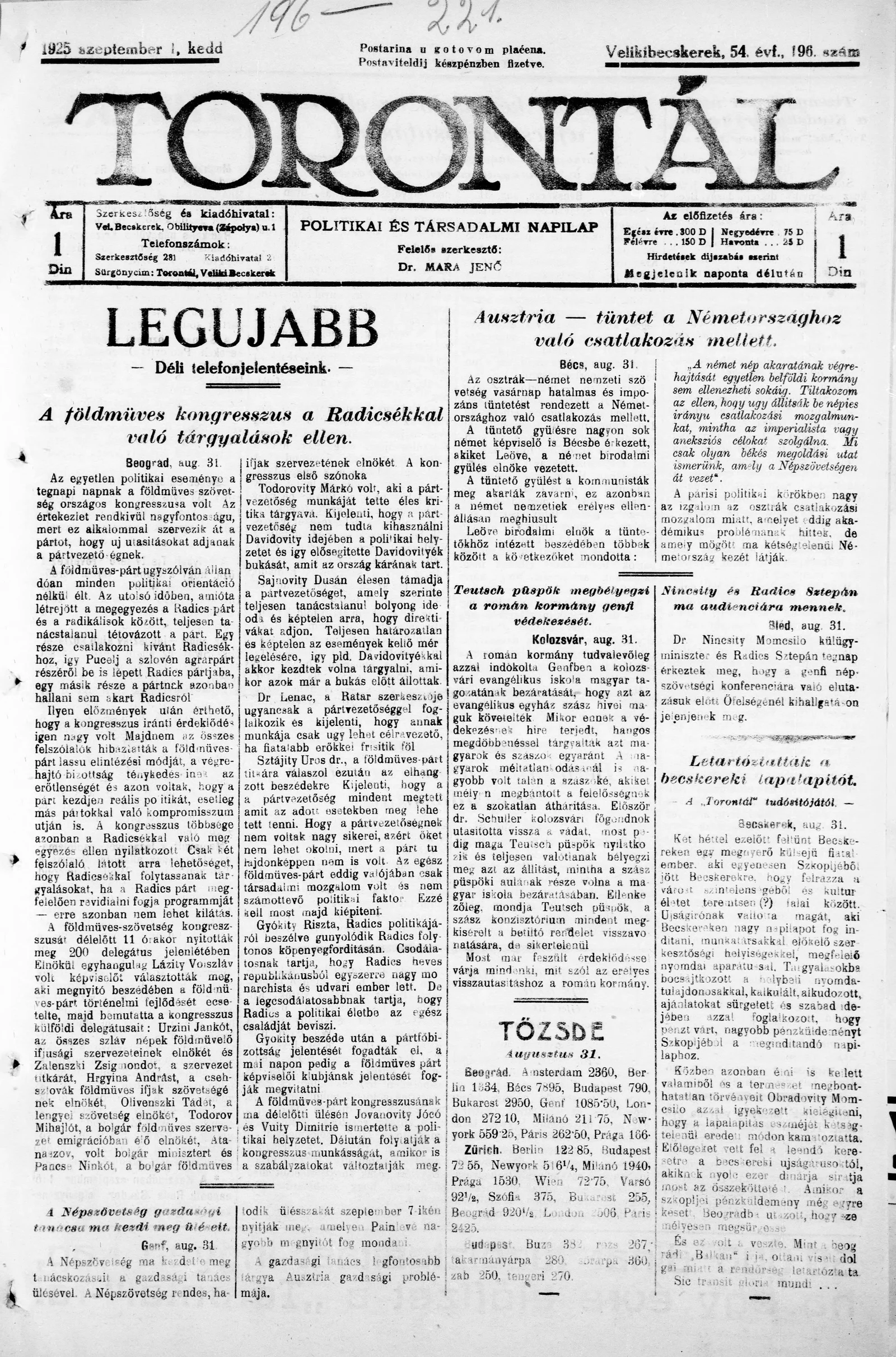 Torontál, 54. évf. 1925. szeptember 1. 196. sz.