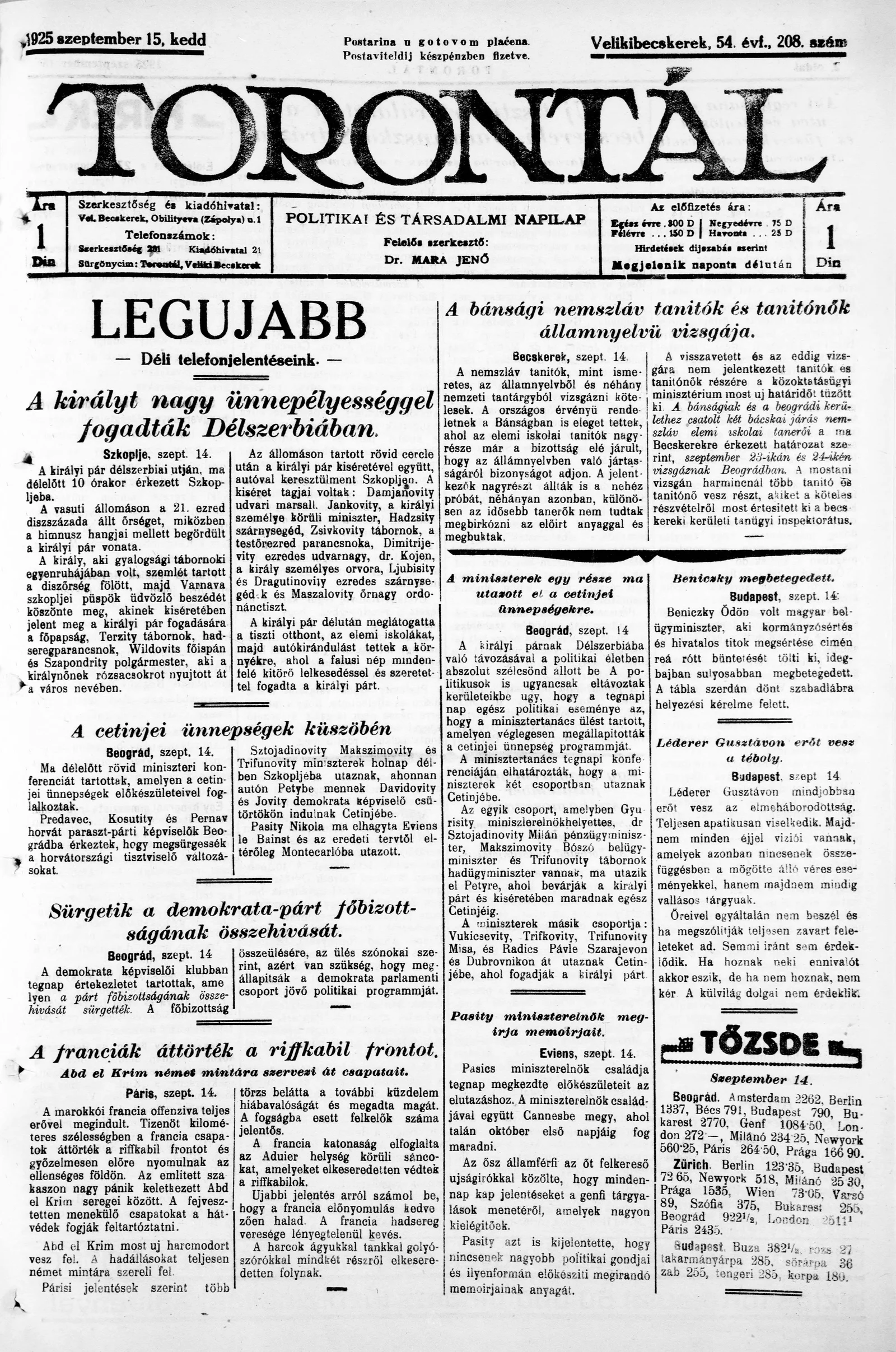 Torontál, 54. évf. 1925. szeptember 15. 208. sz.