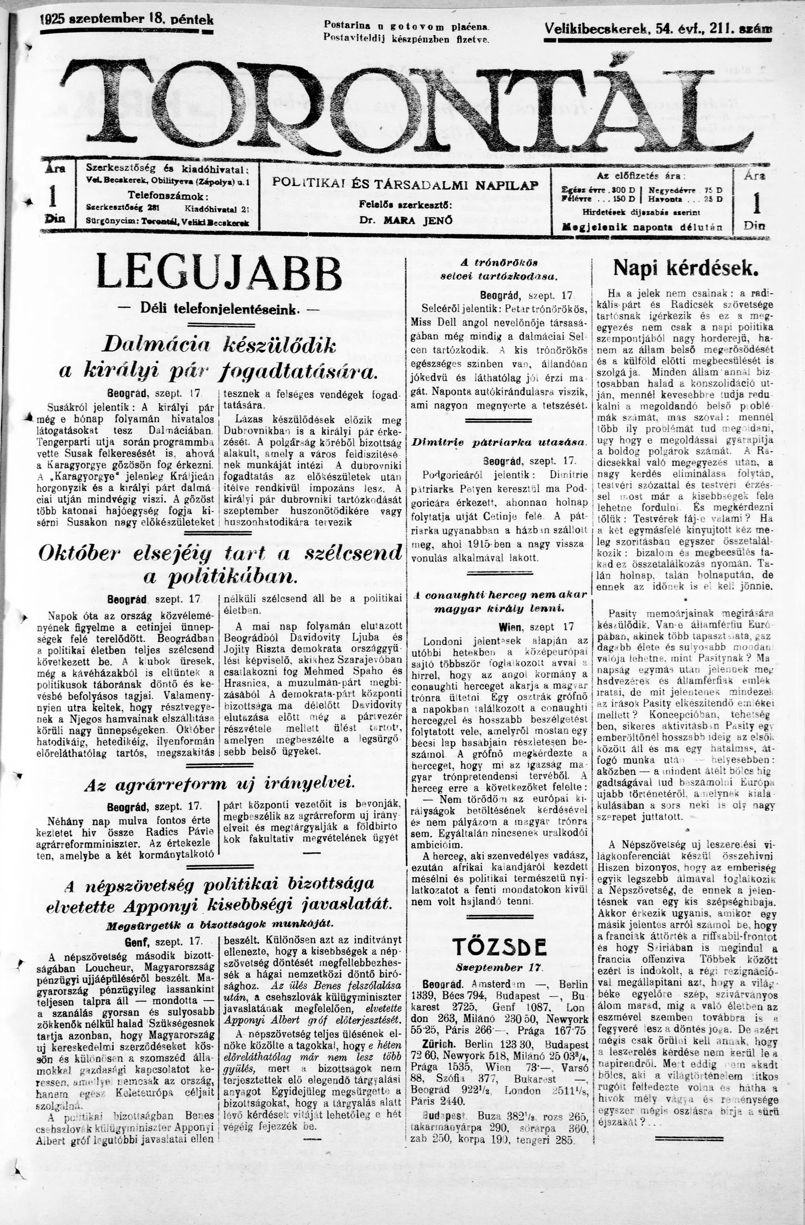 Torontál, 54. évf. 1925. szeptember 18. 211. sz.