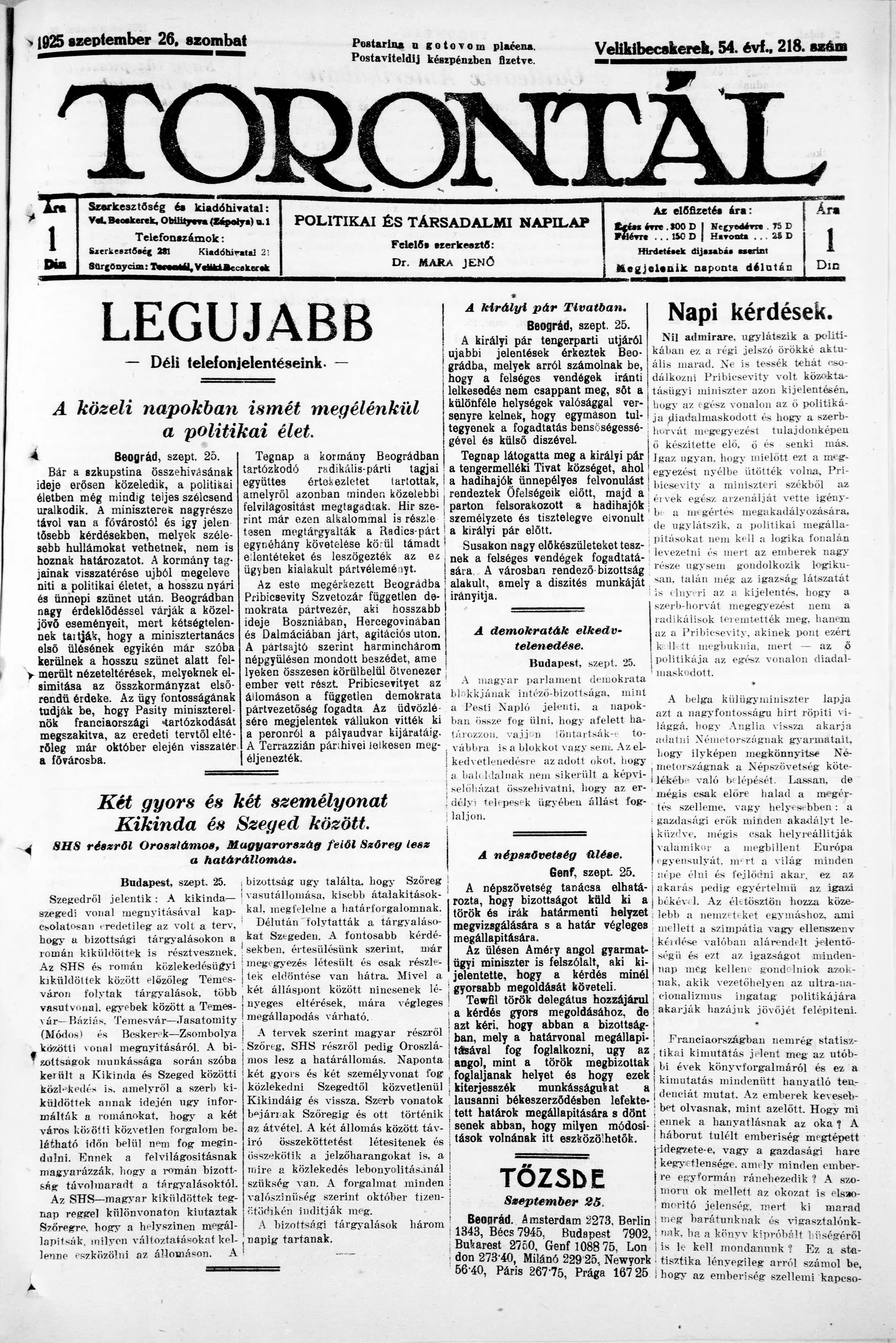 Torontál, 54. évf. 1925. szeptember 26. 218. sz.