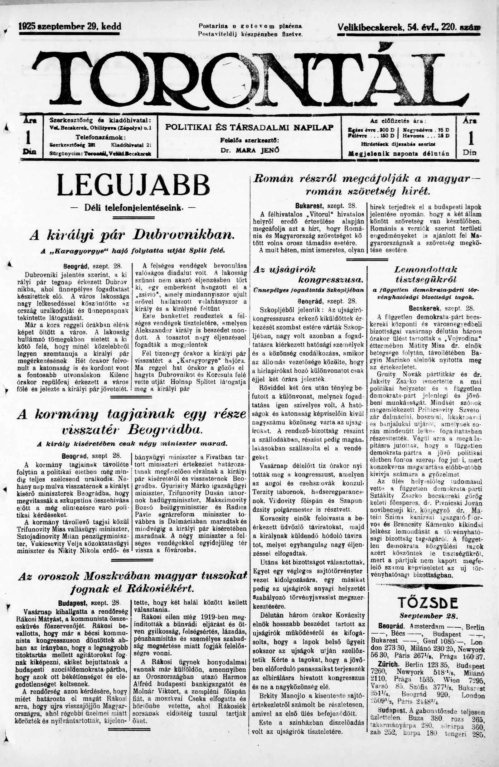 Torontál, 54. évf. 1925. szeptember 29. 220. sz.