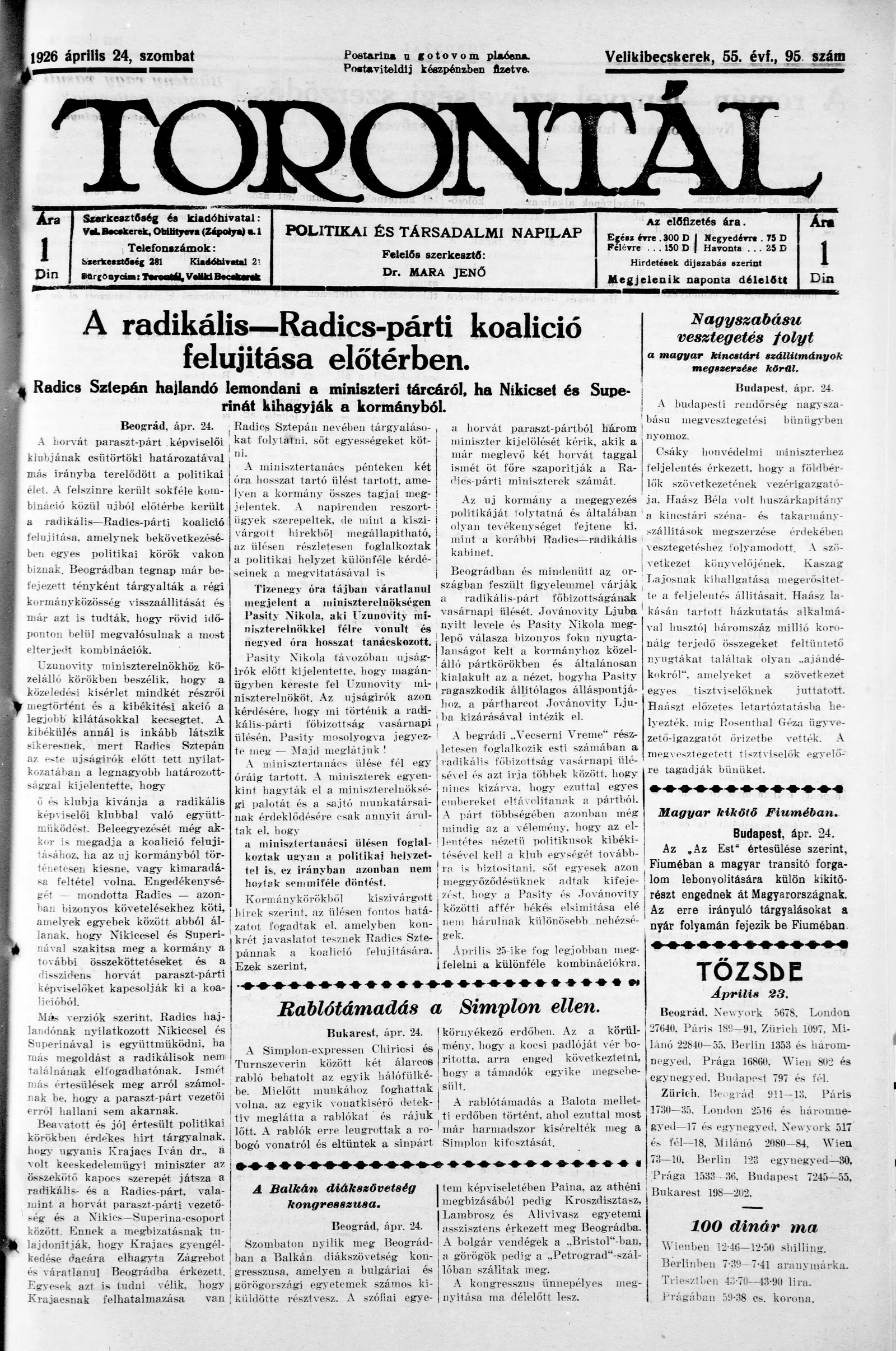 Torontál, 55. évf. 1926. április 24. 95. sz.