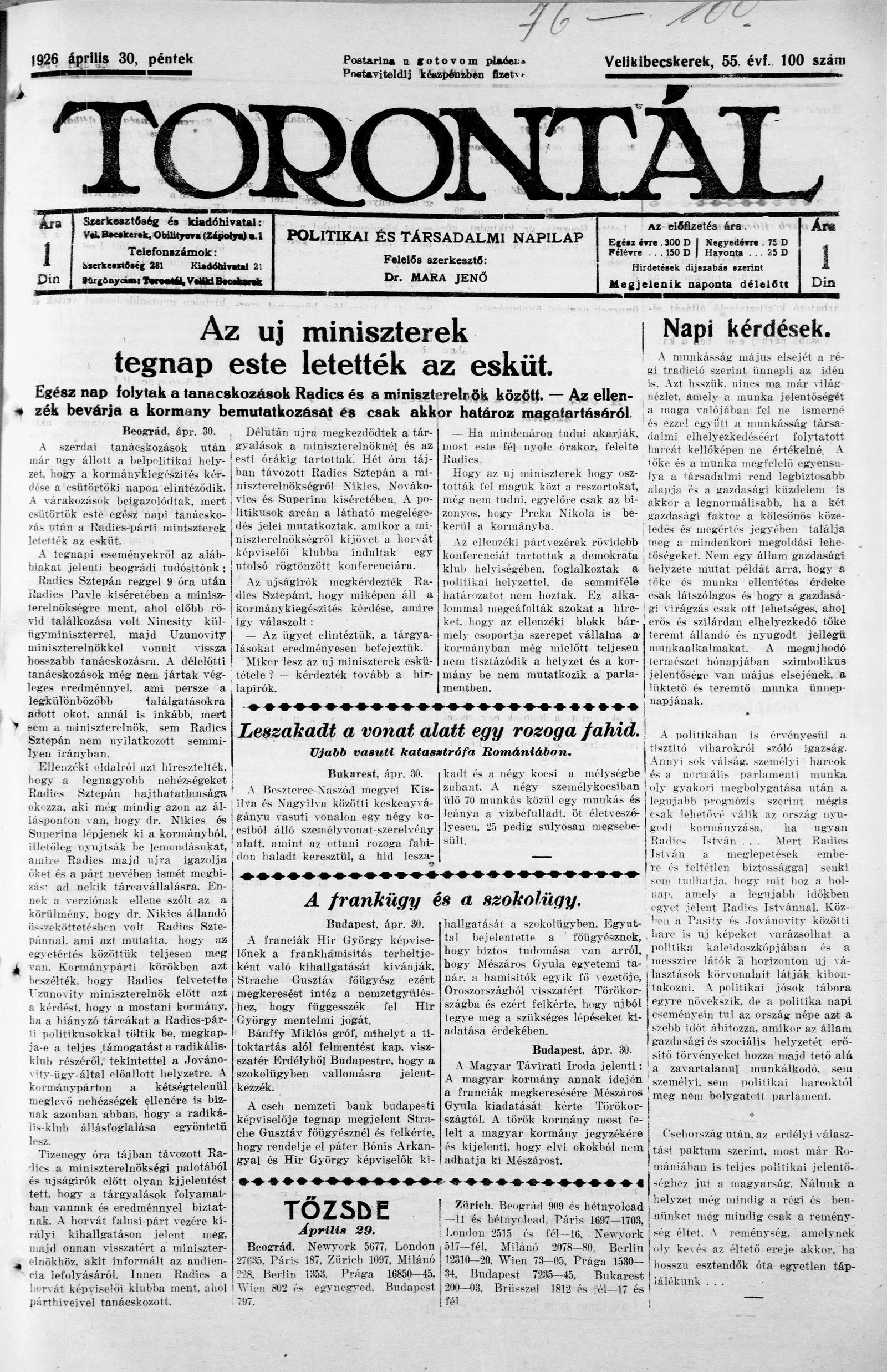 Torontál, 55. évf. 1926. április 30. 100. sz.