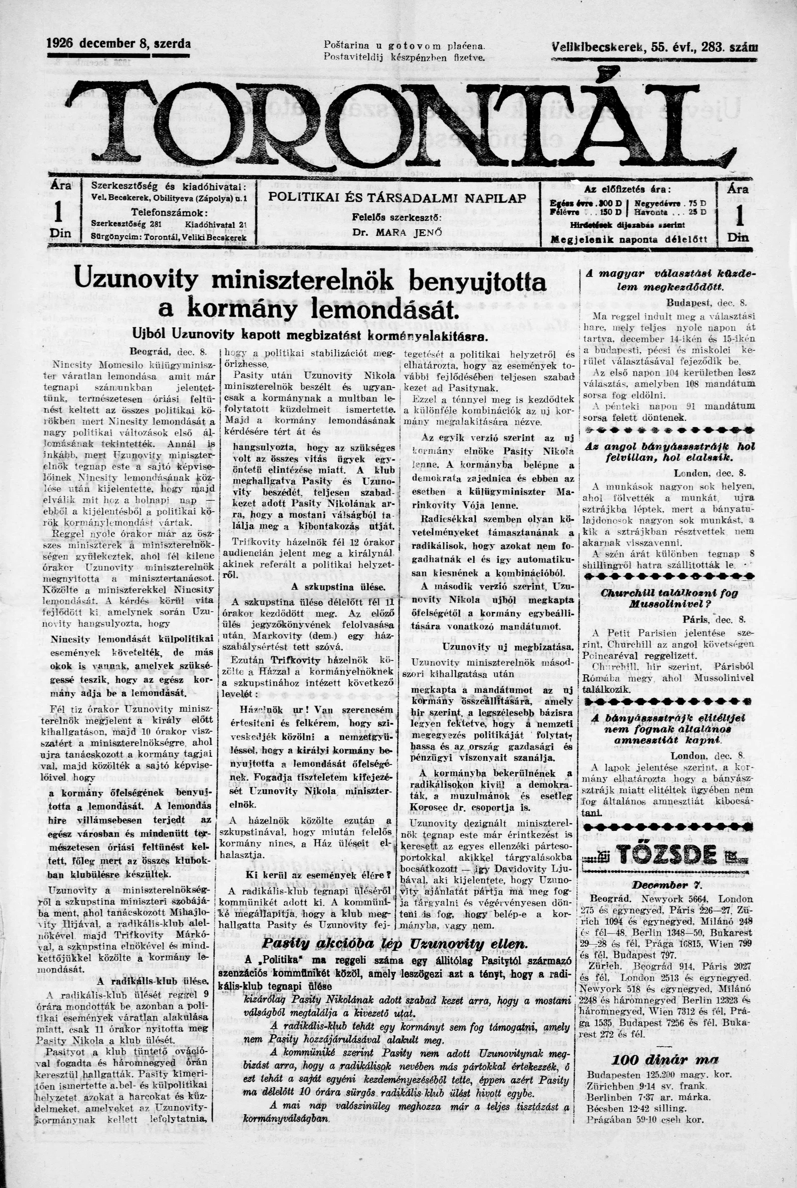 Torontál, 55. évf. 1926. december 8. 283. sz.