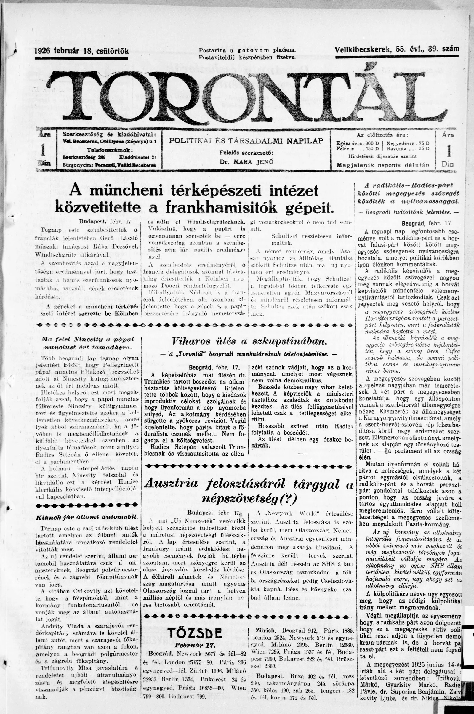 Torontál, 55. évf. 1926. február 18. 39. sz.