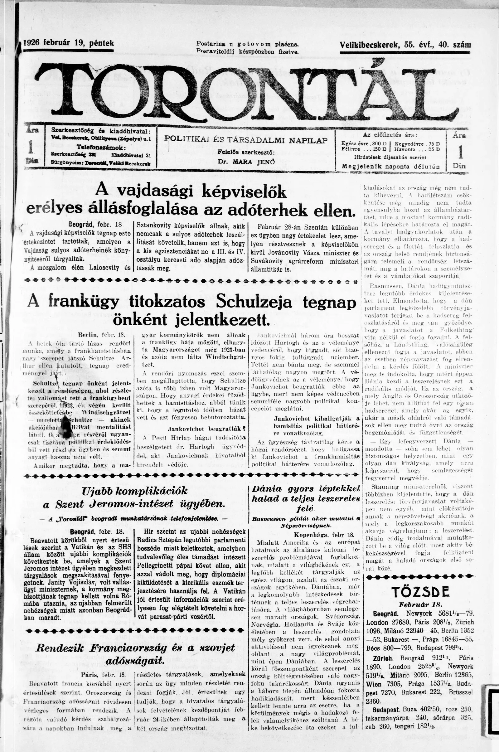 Torontál, 55. évf. 1926. február 19. 40. sz.