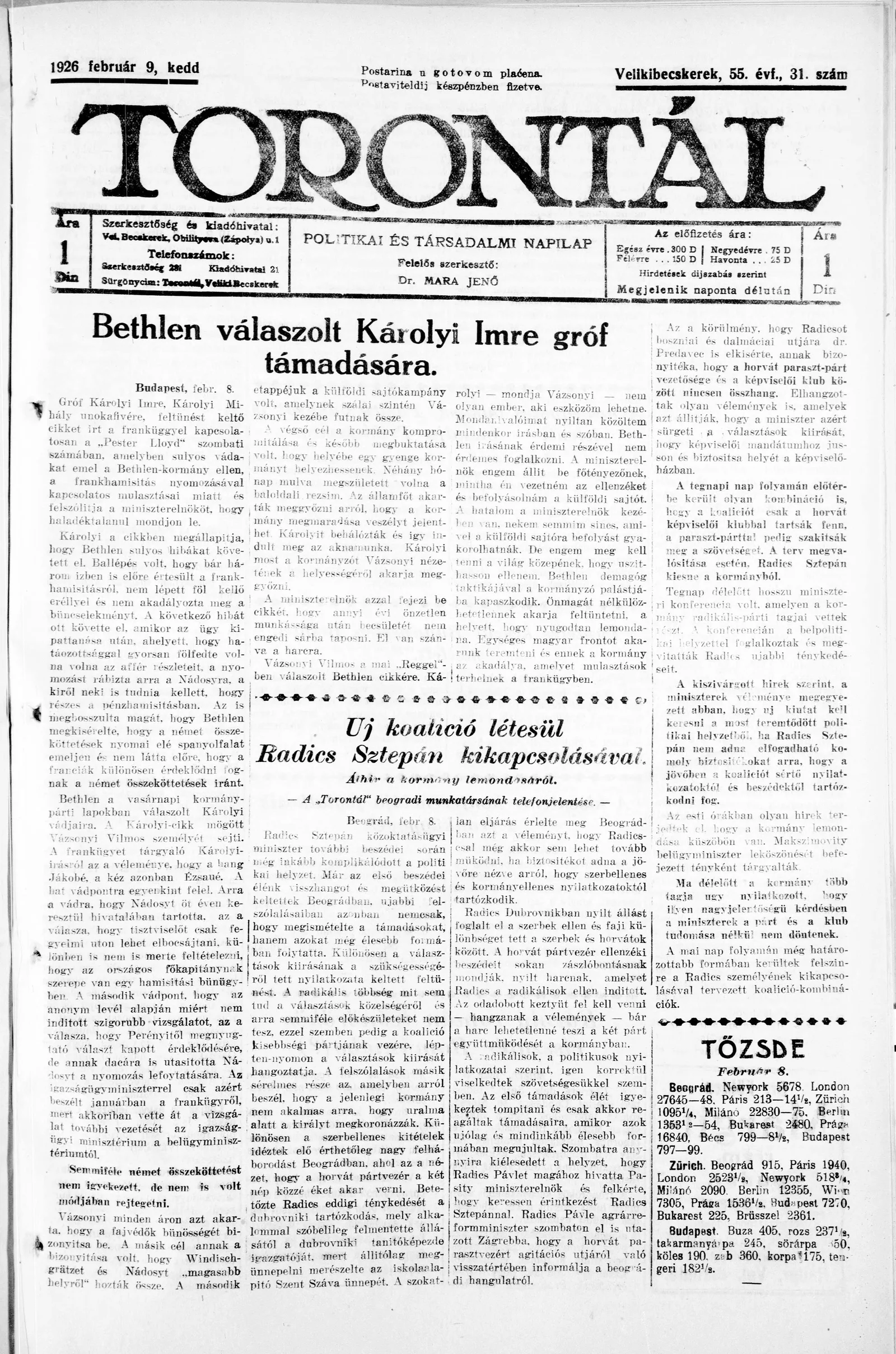 Torontál, 55. évf. 1926. február 9. 31. sz.