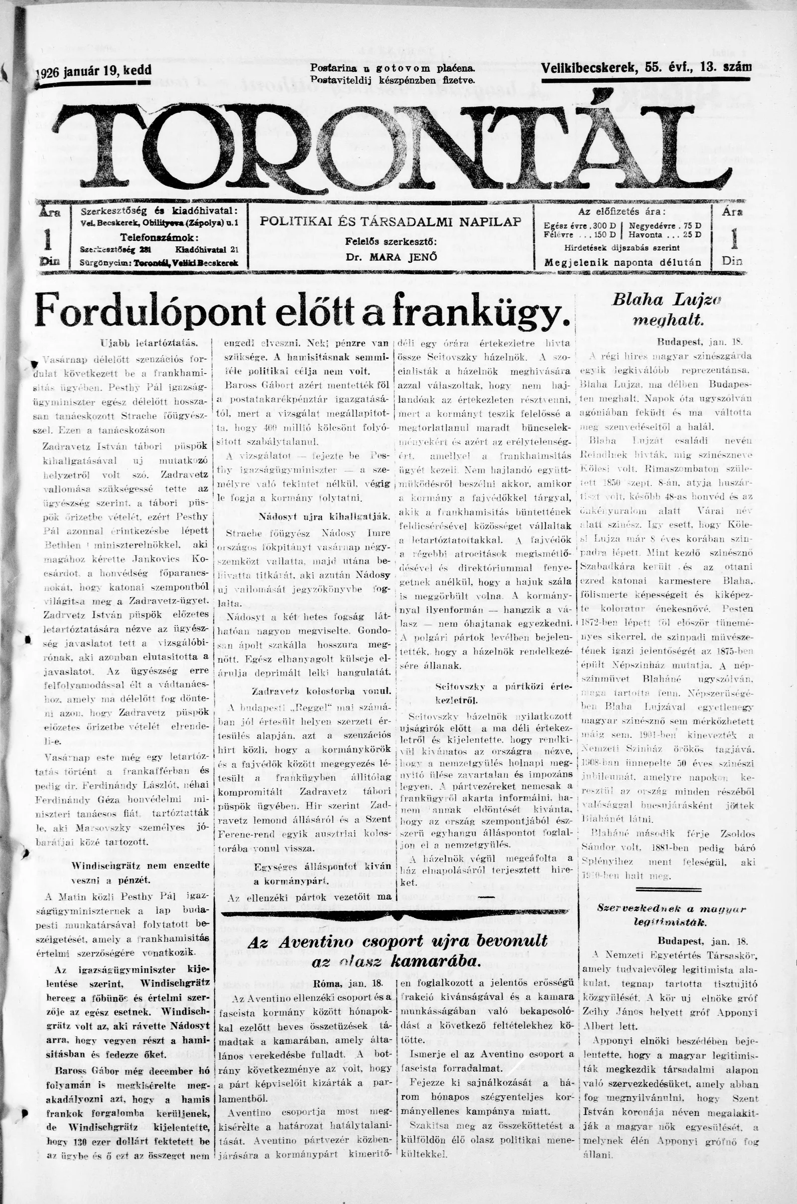 Torontál, 55. évf. 1926. január 19. 13. sz.
