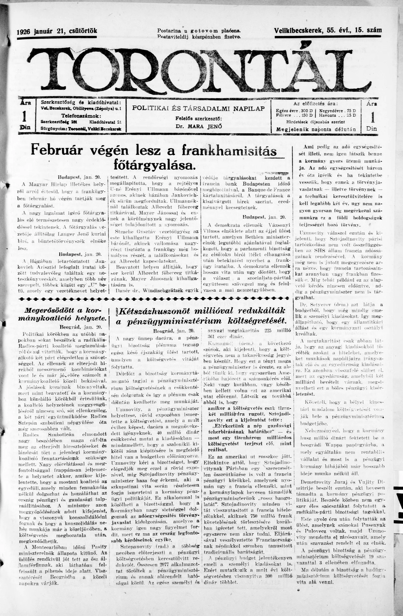 Torontál, 55. évf. 1926. január 21. 15. sz.