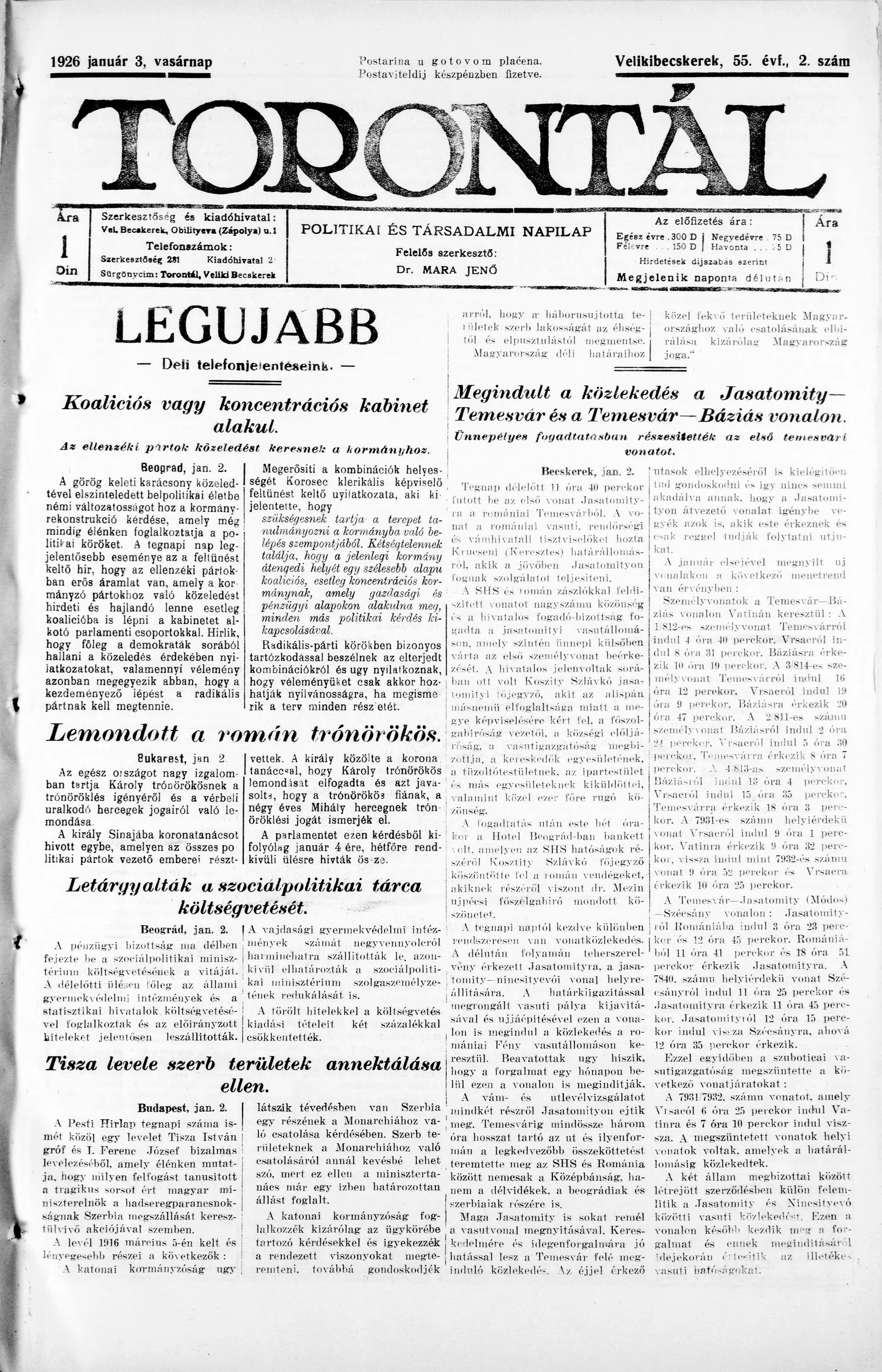 Torontál, 55. évf. 1926. január 3. 2. sz.