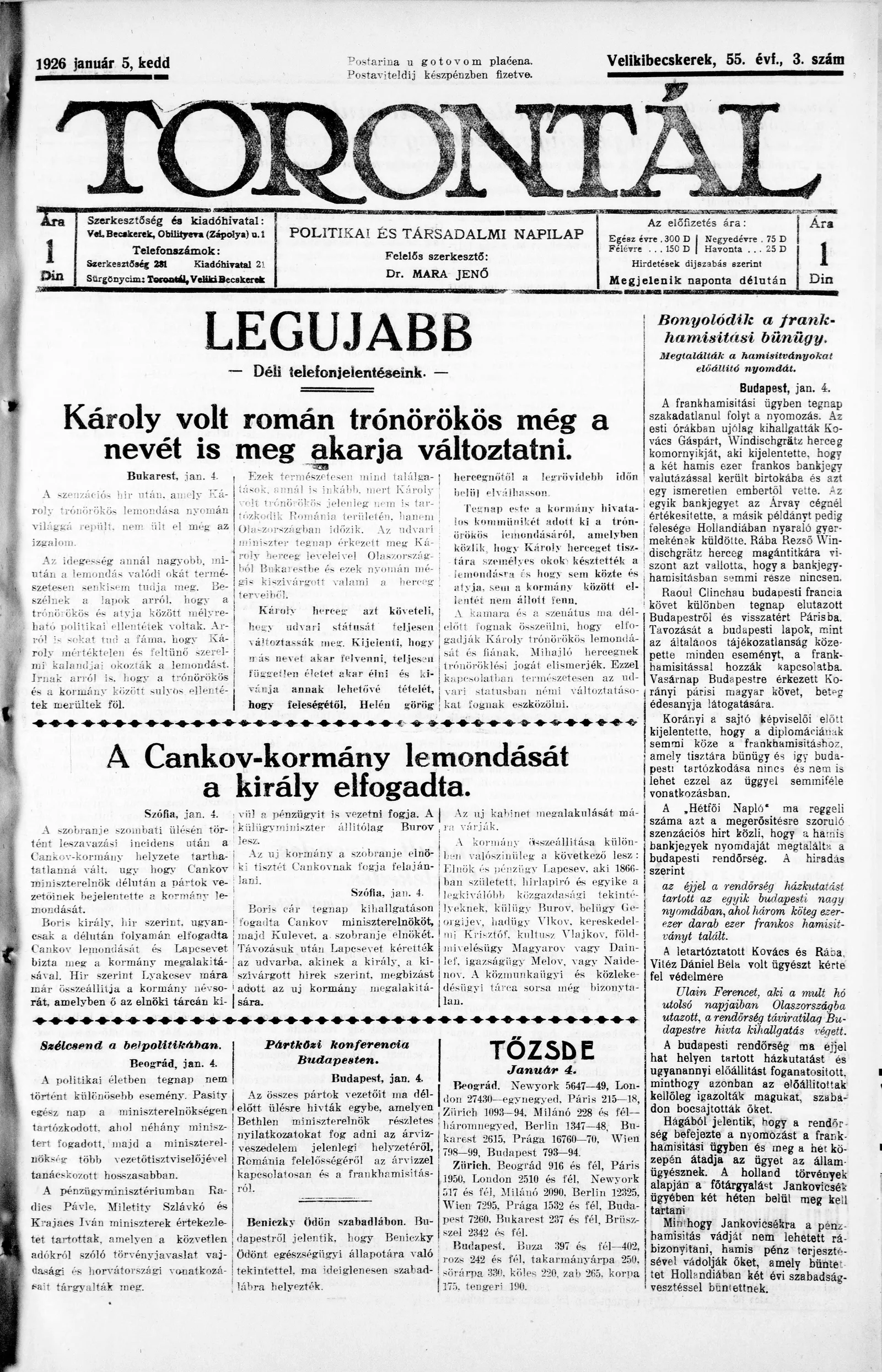 Torontál, 55. évf. 1926. január 5. 3. sz.