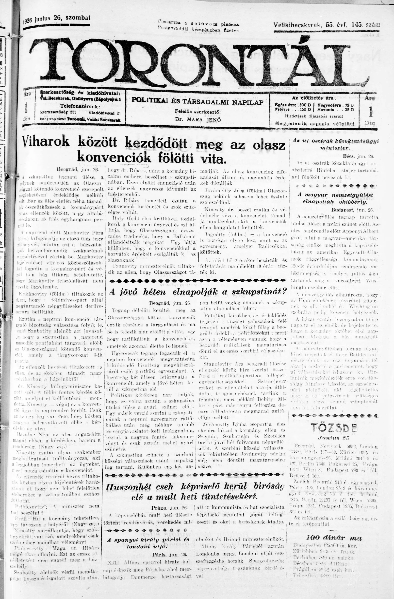 Torontál, 55. évf. 1926. június 26. 145. sz.