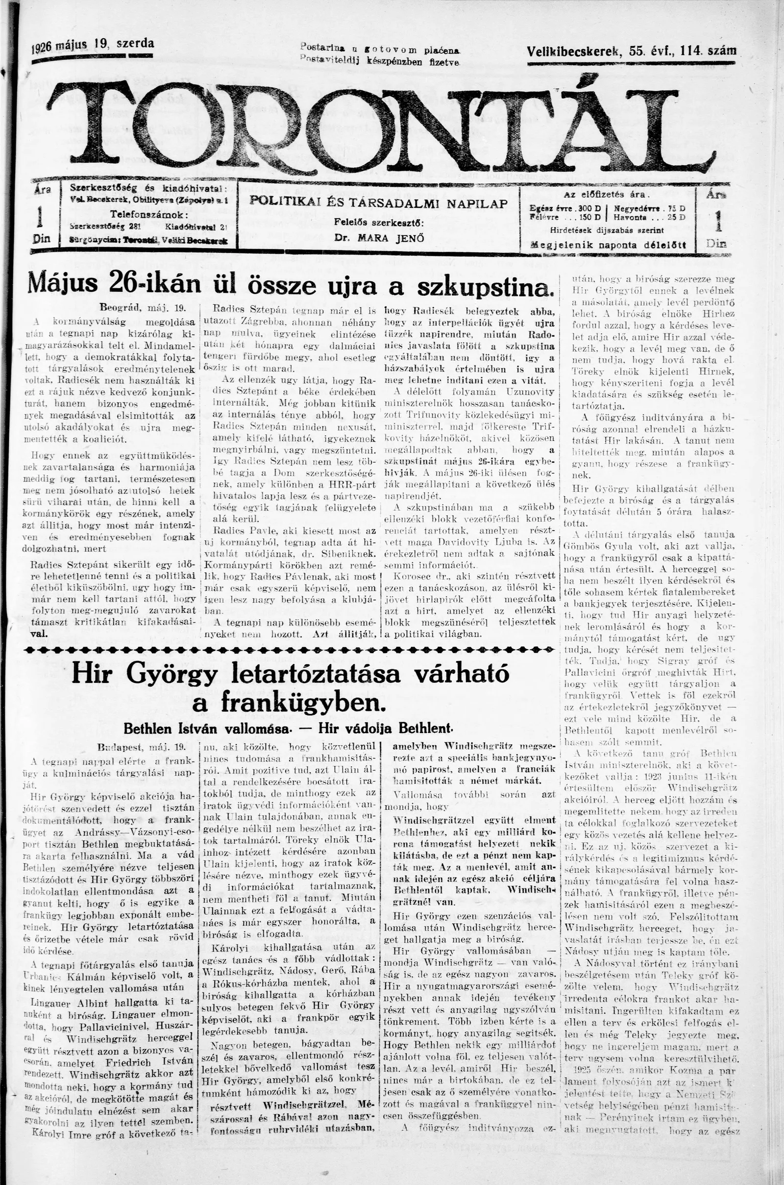 Torontál, 55. évf. 1926. május 19. 114. sz.