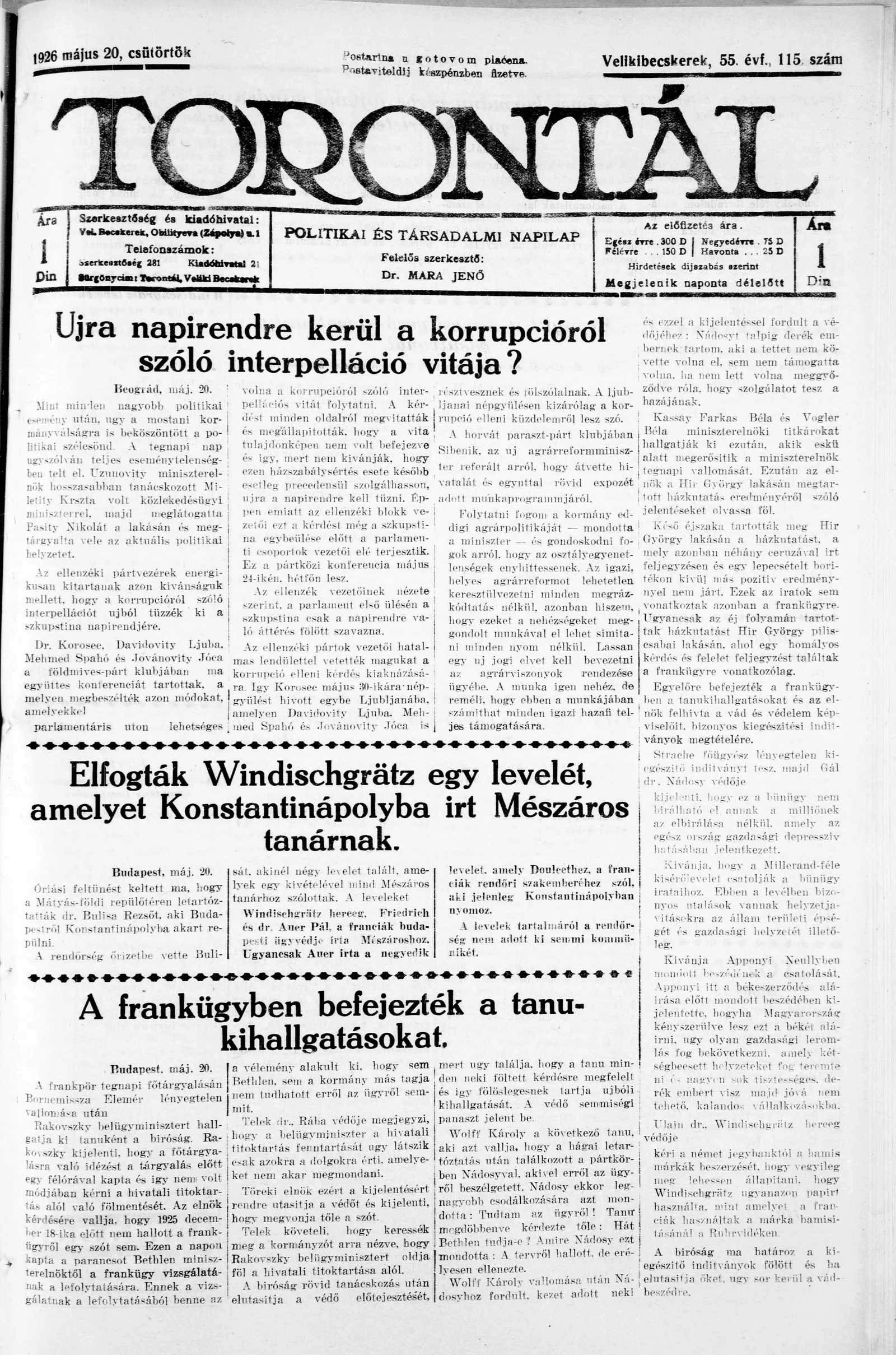 Torontál, 55. évf. 1926. május 20. 115. sz.