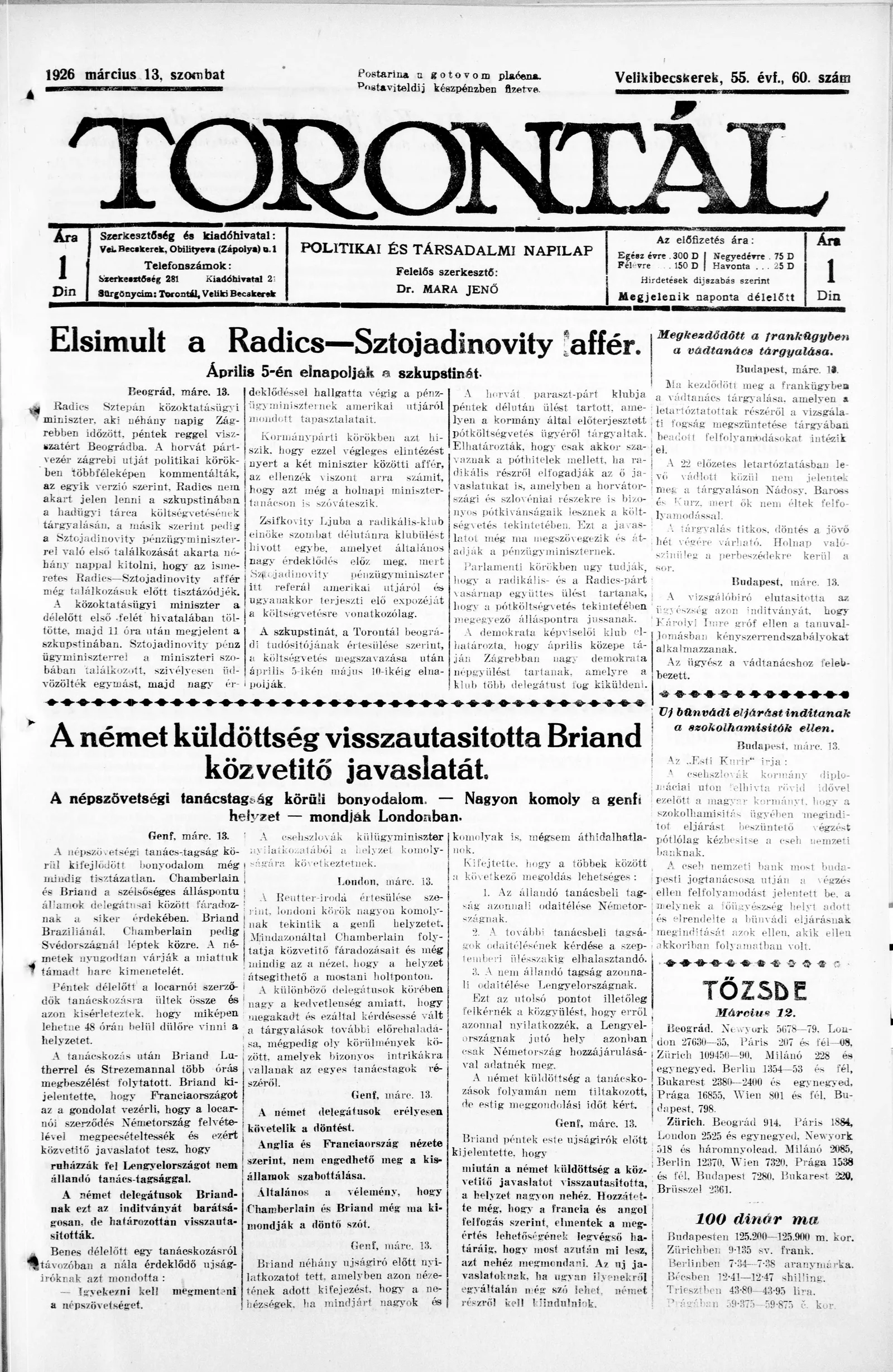 Torontál, 55. évf. 1926. március 13. 60. sz.