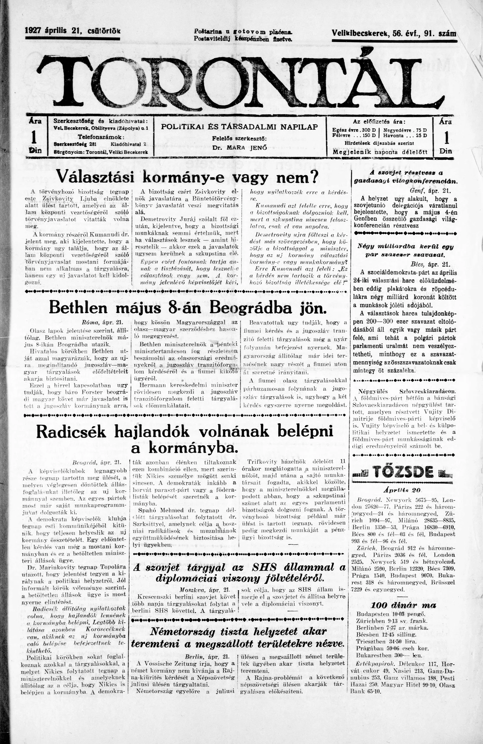 Torontál, 56. évf. 1927. április 21. 91. sz.