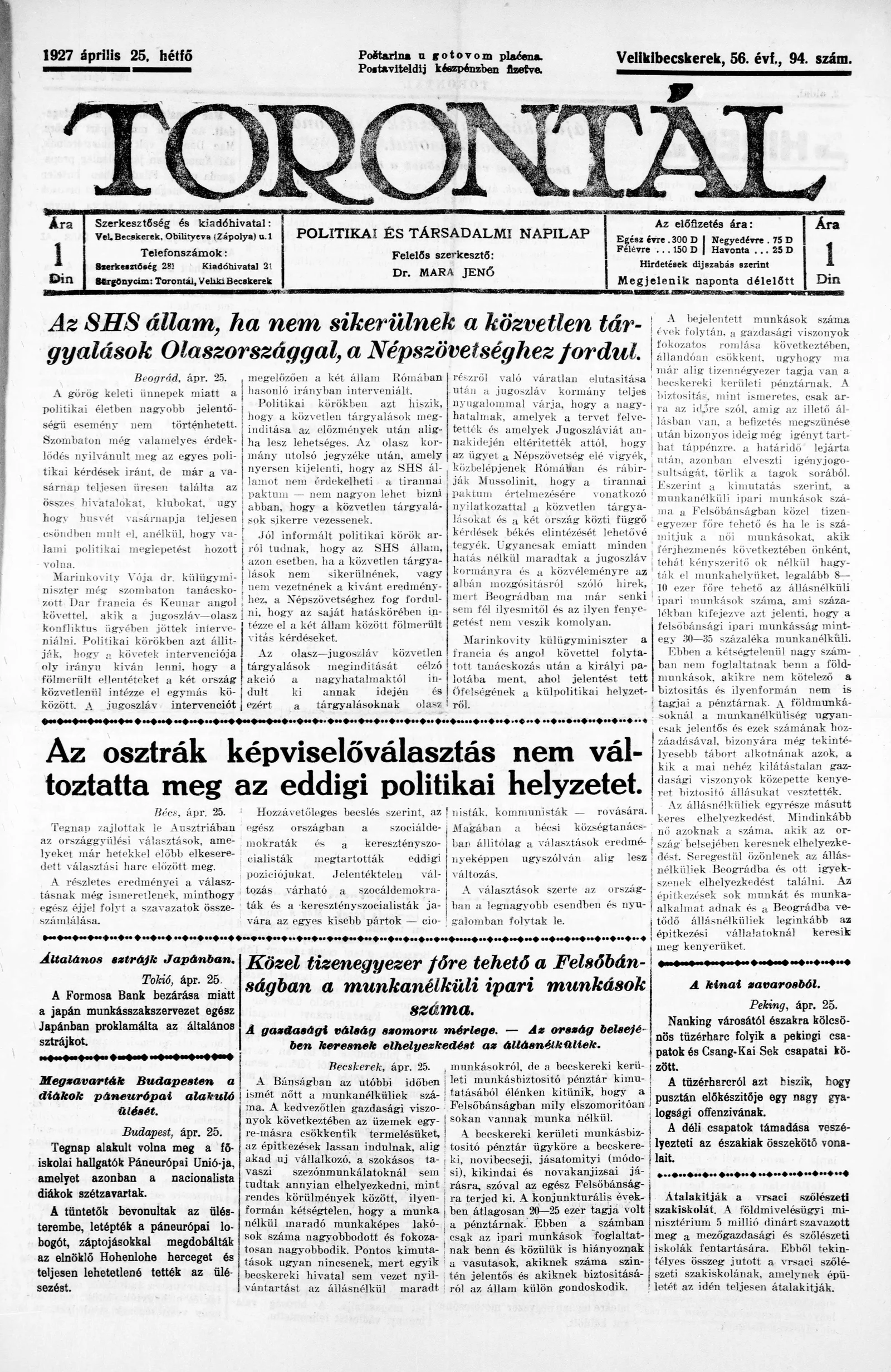 Torontál, 56. évf. 1927. április 25. 94. sz.