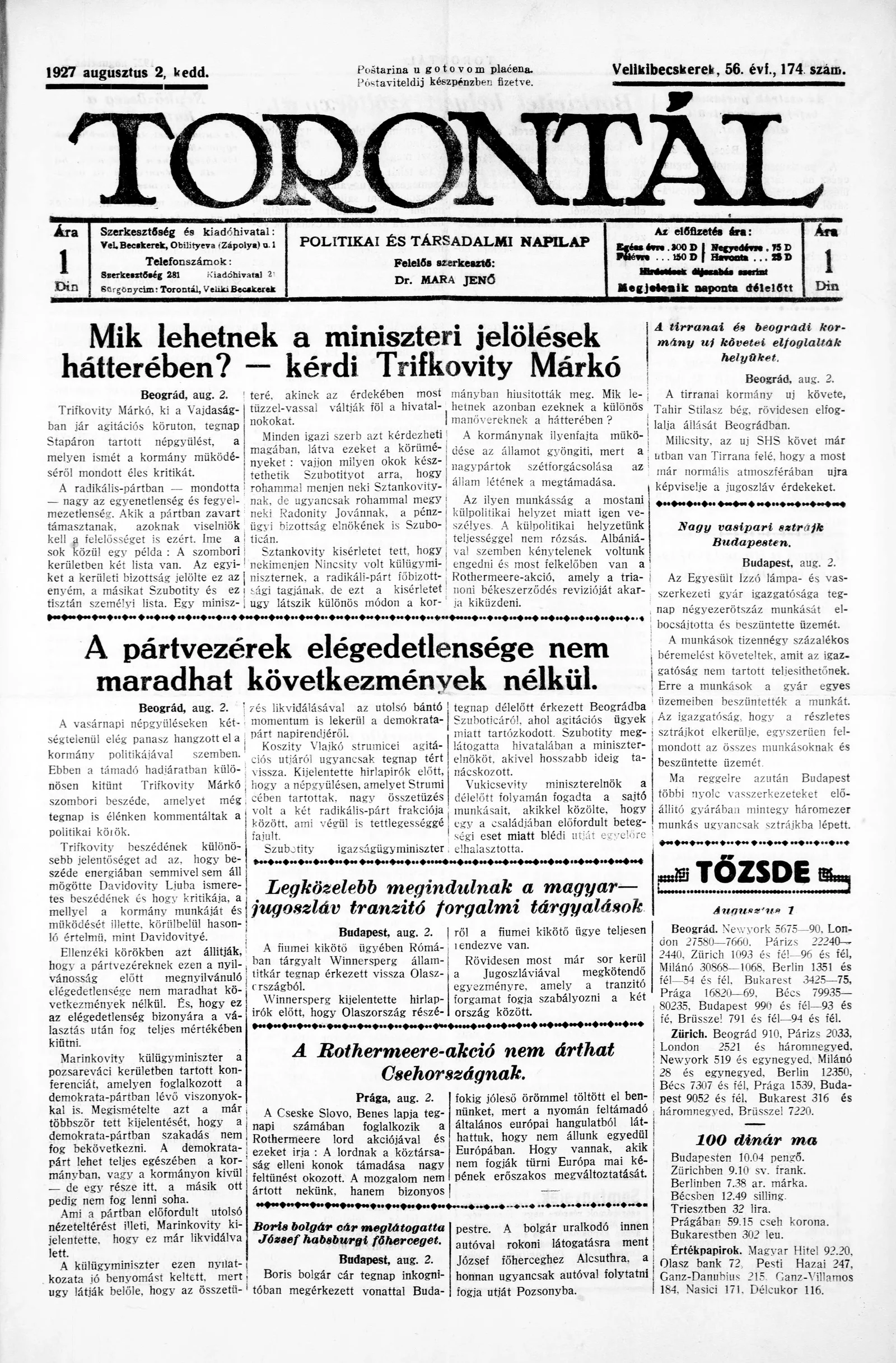 Torontál, 56. évf. 1927. augusztus 2. 174. sz.