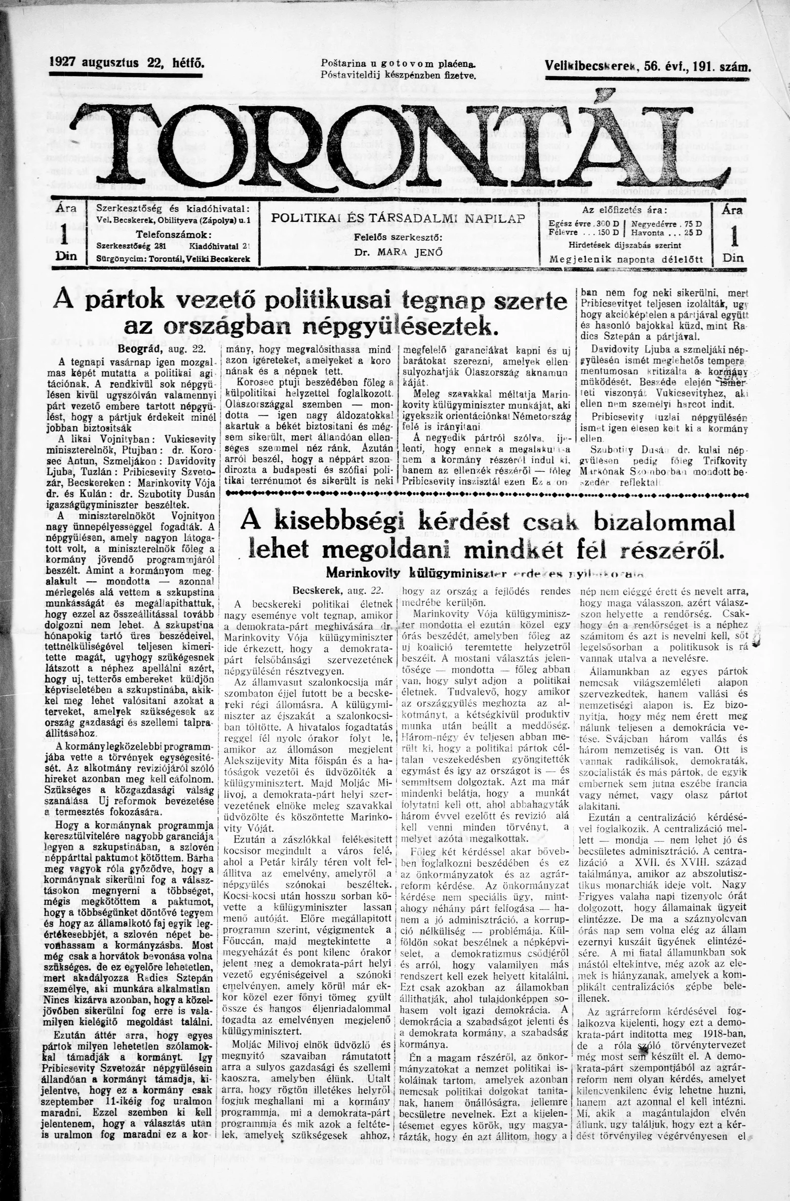 Torontál, 56. évf. 1927. augusztus 22. 191. sz.