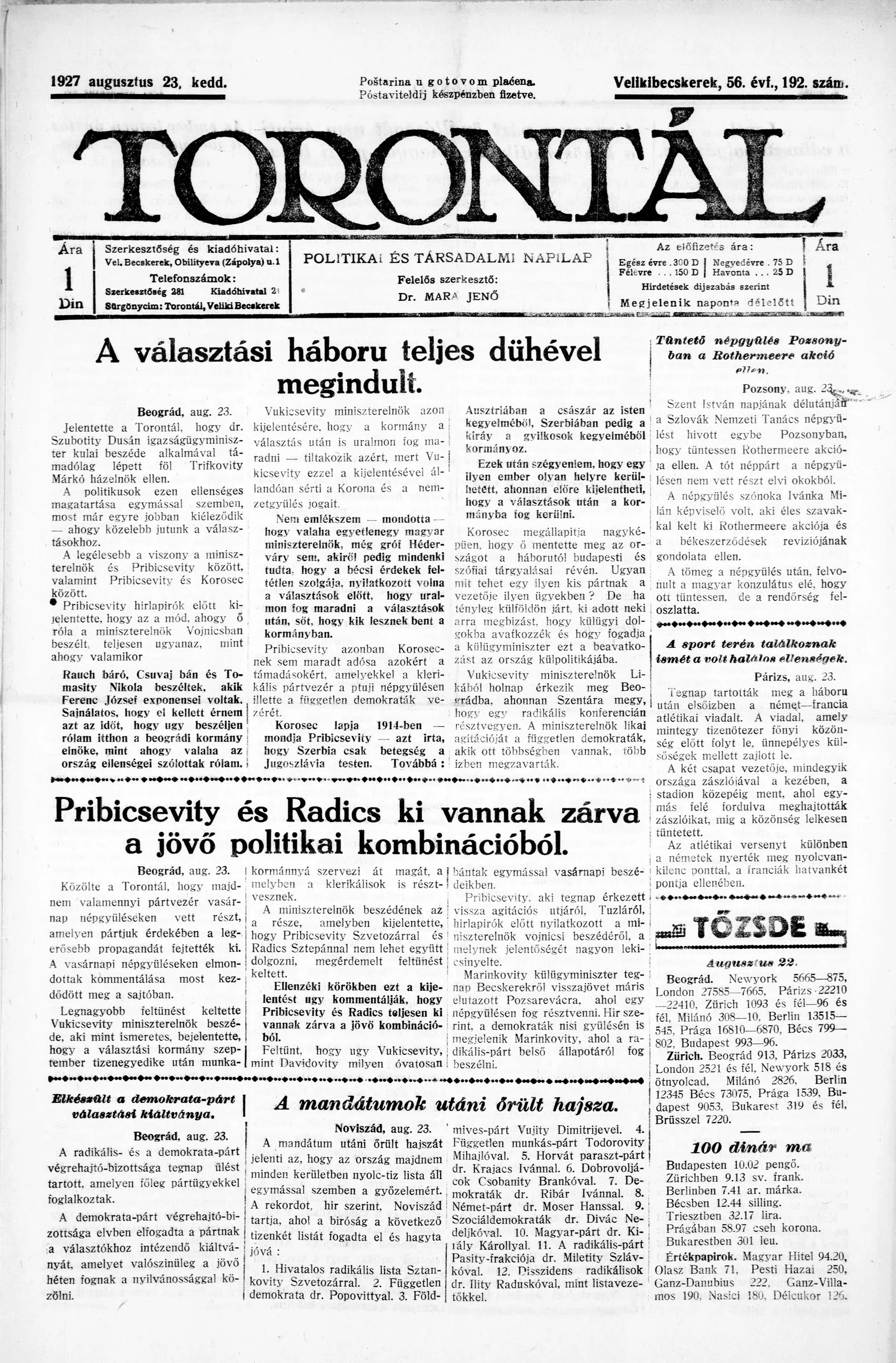 Torontál, 56. évf. 1927. augusztus 23. 192. sz.