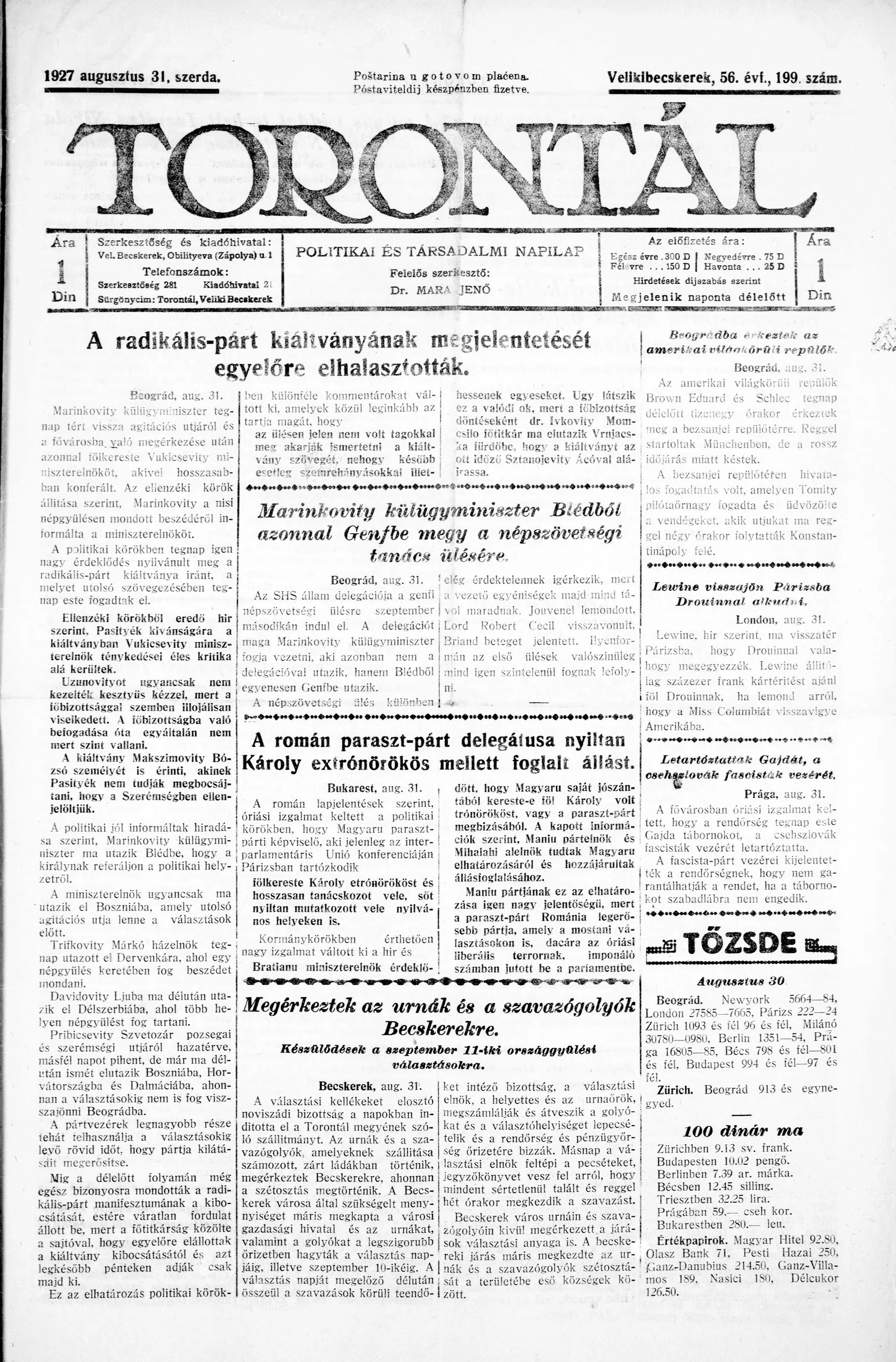 Torontál, 56. évf. 1927. augusztus 31. 199. sz.