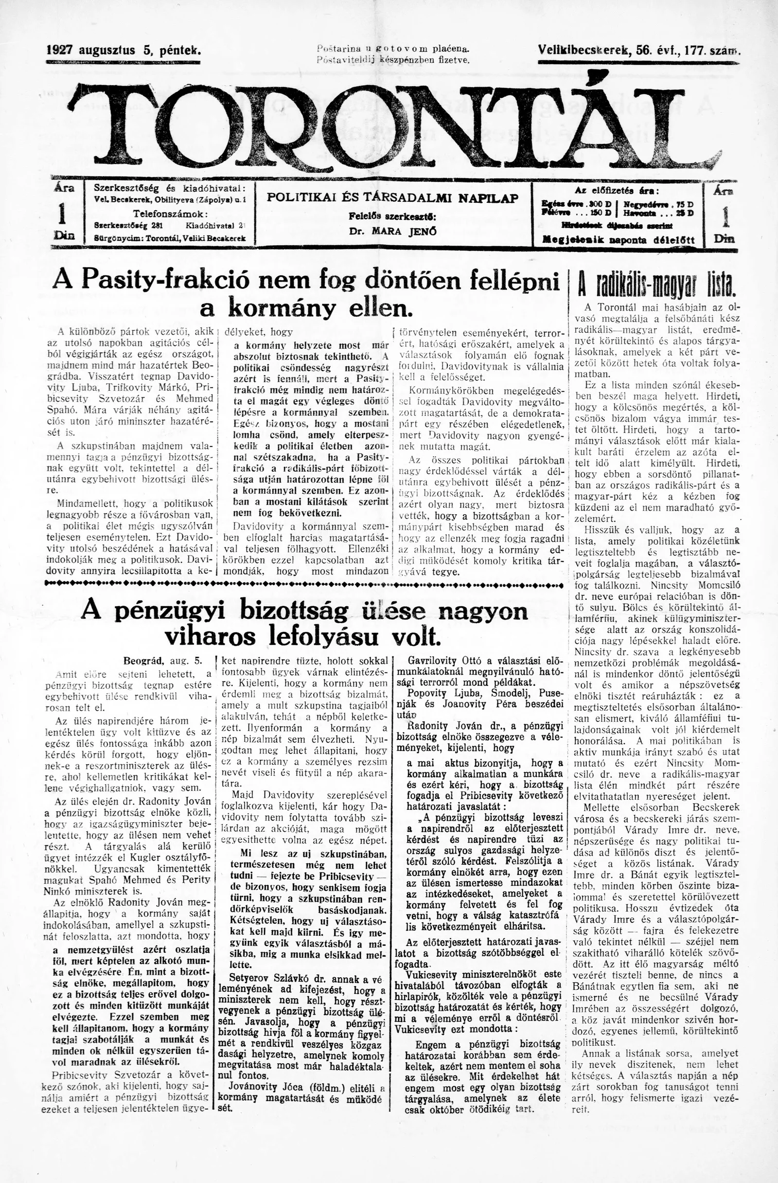 Torontál, 56. évf. 1927. augusztus 5. 177. sz.
