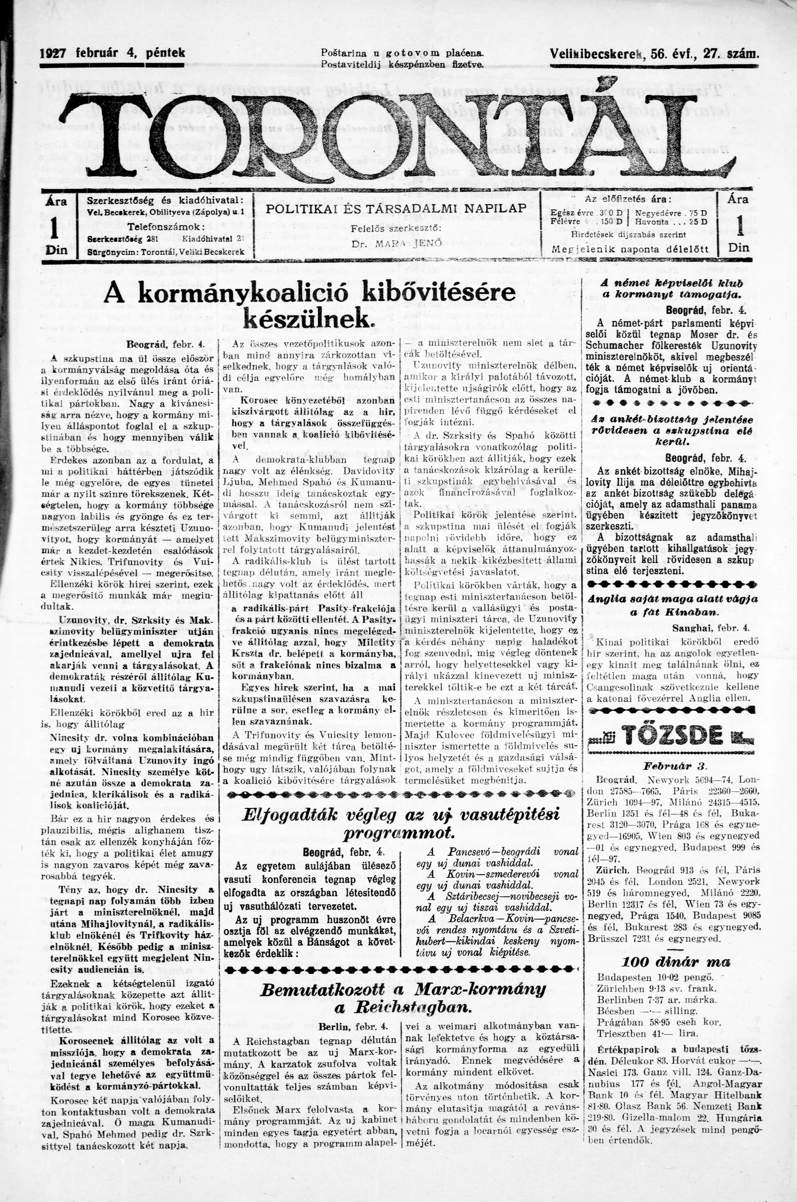 Torontál, 56. évf. 1927. február 4. 27. sz.