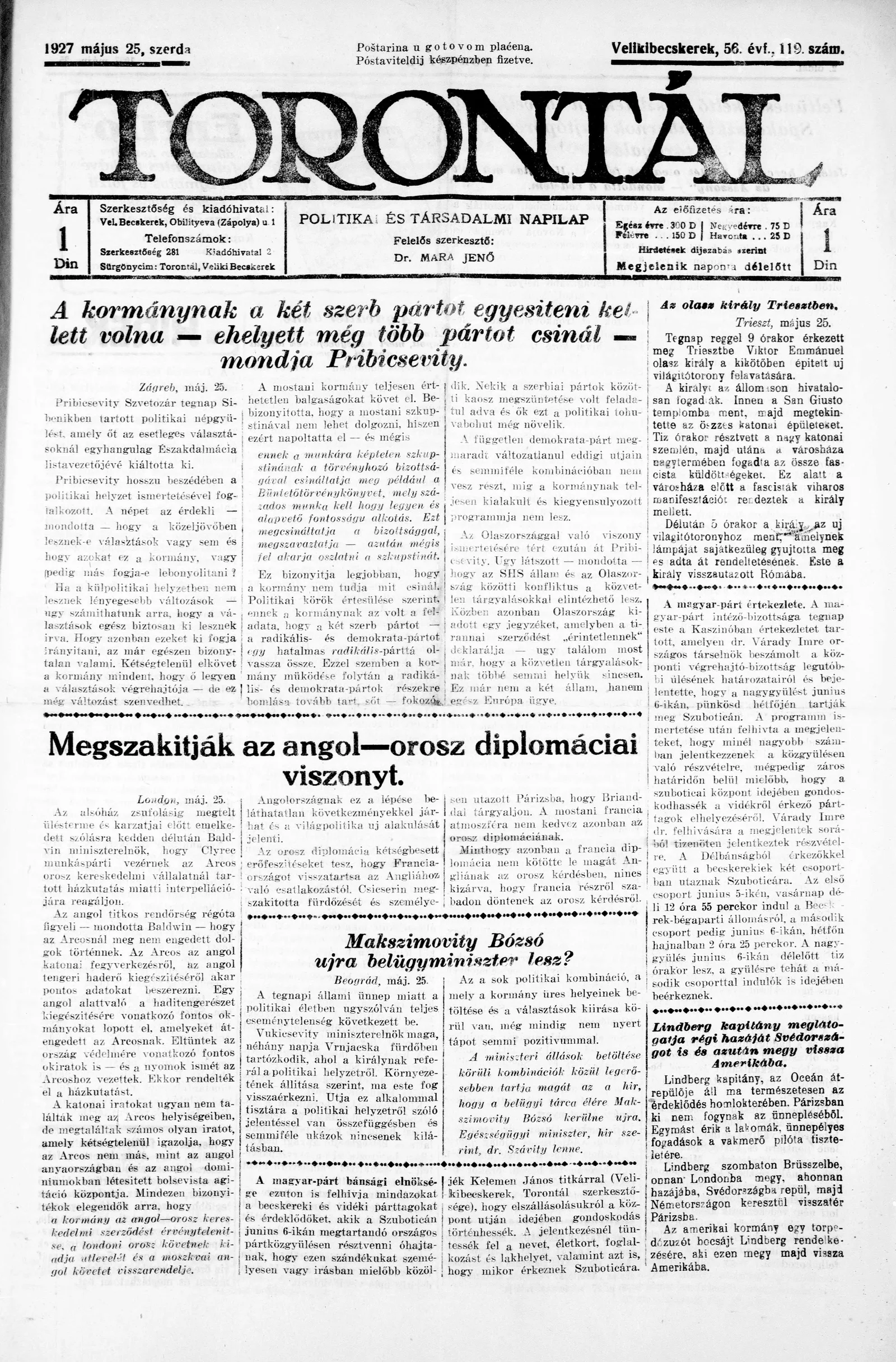 Torontál, 56. évf. 1927. május 25. 119. sz.