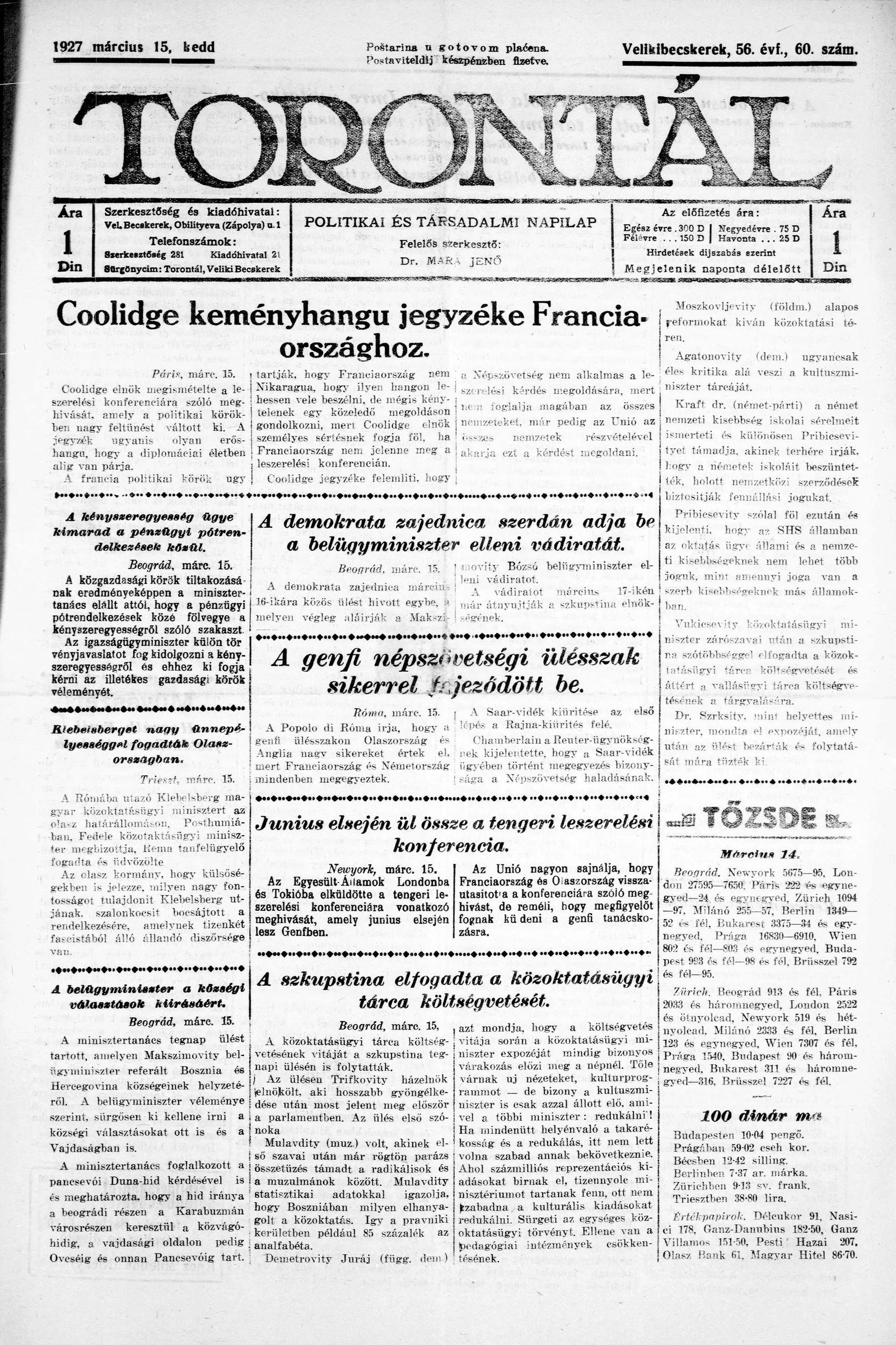 Torontál, 56. évf. 1927. március 15. 60. sz.