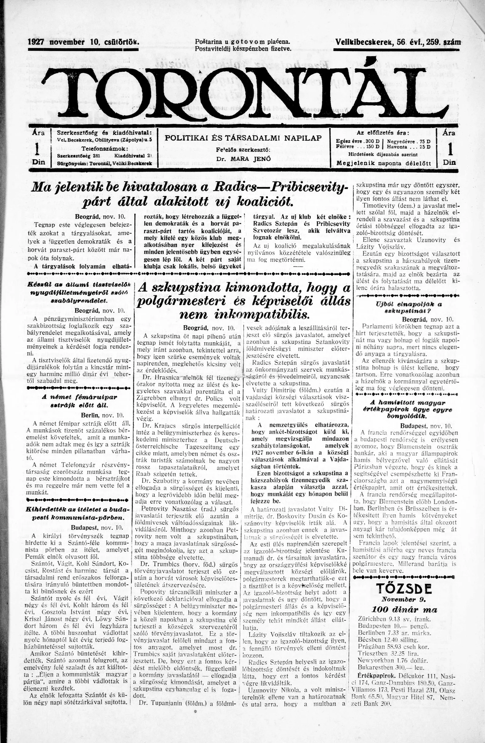 Torontál, 56. évf. 1927. november 10. 259. sz.