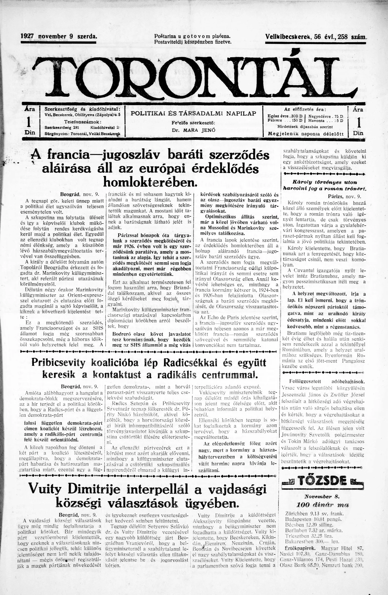 Torontál, 56. évf. 1927. november 21. 268. sz.