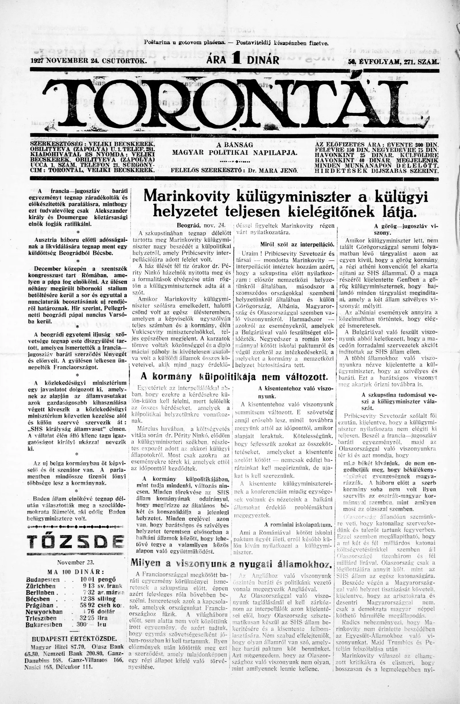 Torontál, 56. évf. 1927. november 24. 271. sz.
