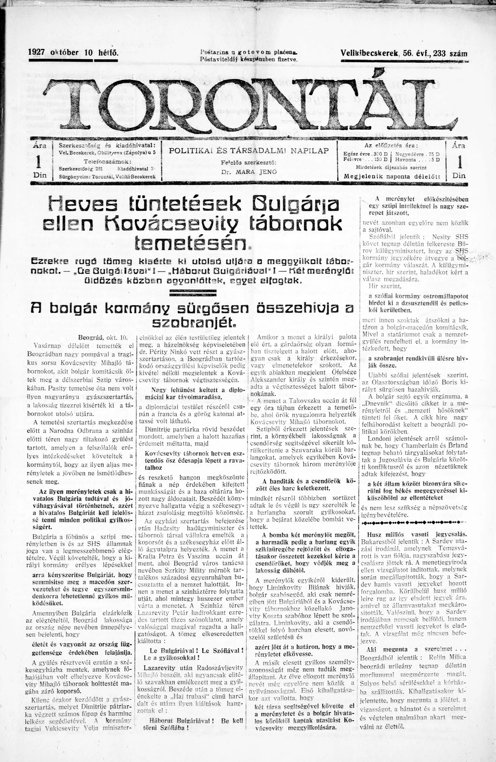 Torontál, 56. évf. 1927. október 10. 233. sz.