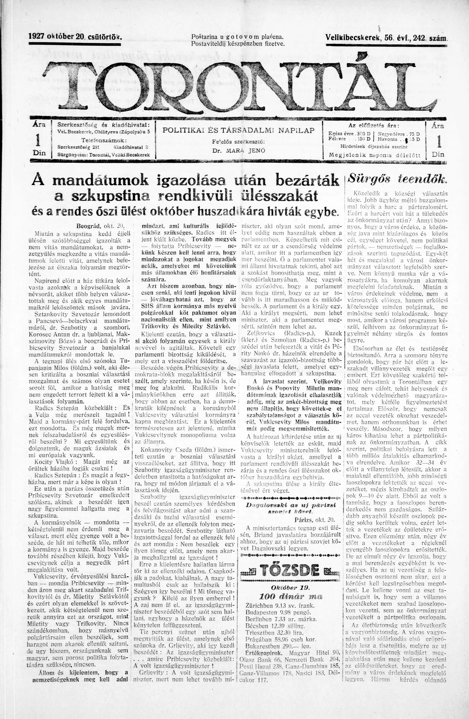 Torontál, 56. évf. 1927. október 20. 242. sz.