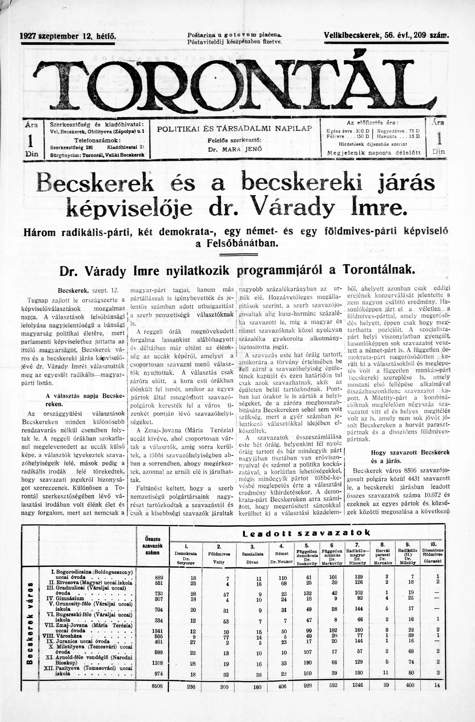 Torontál, 56. évf. 1927. szeptember 12. 209. sz.