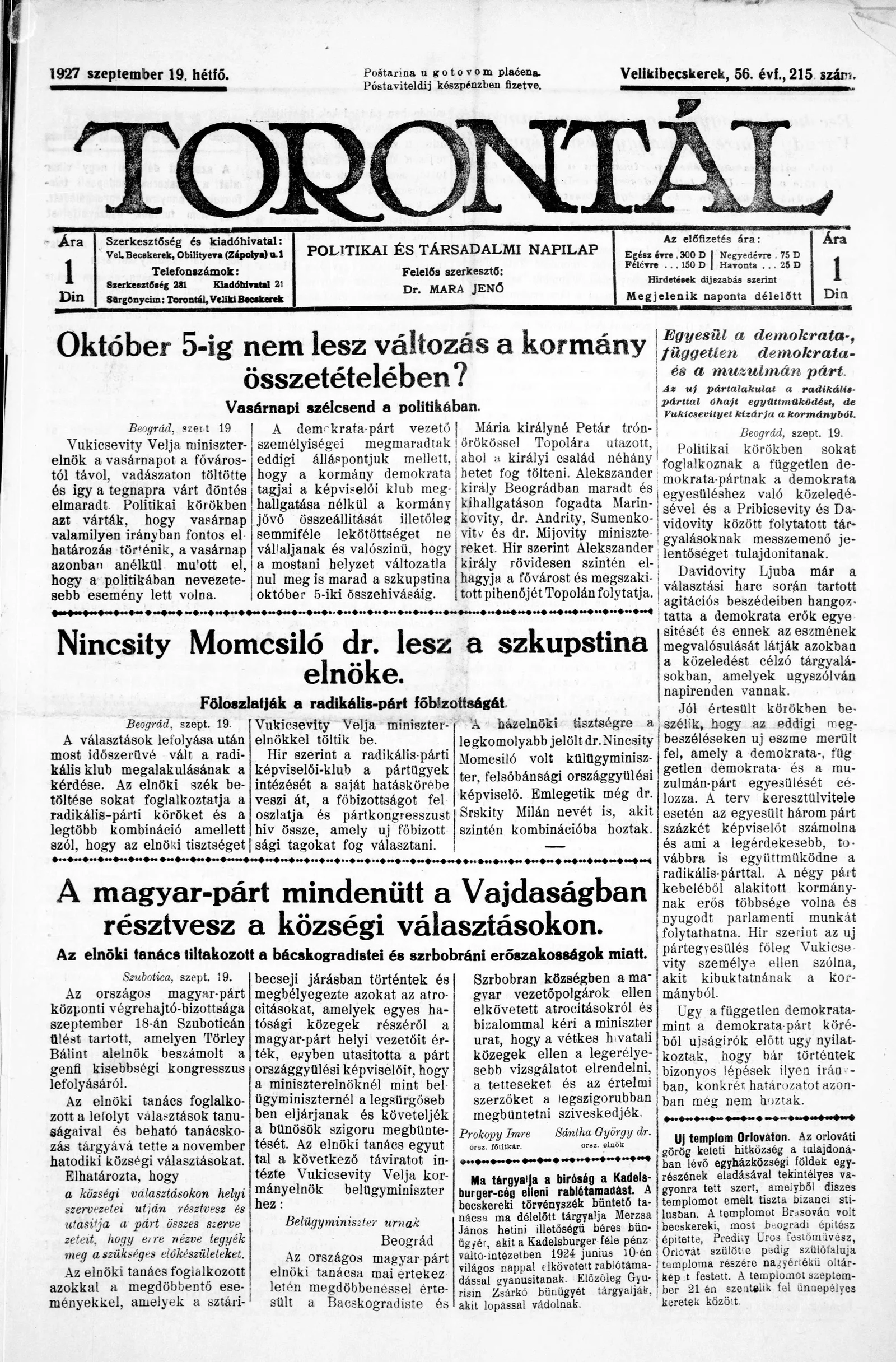 Torontál, 56. évf. 1927. szeptember 19. 215. sz.