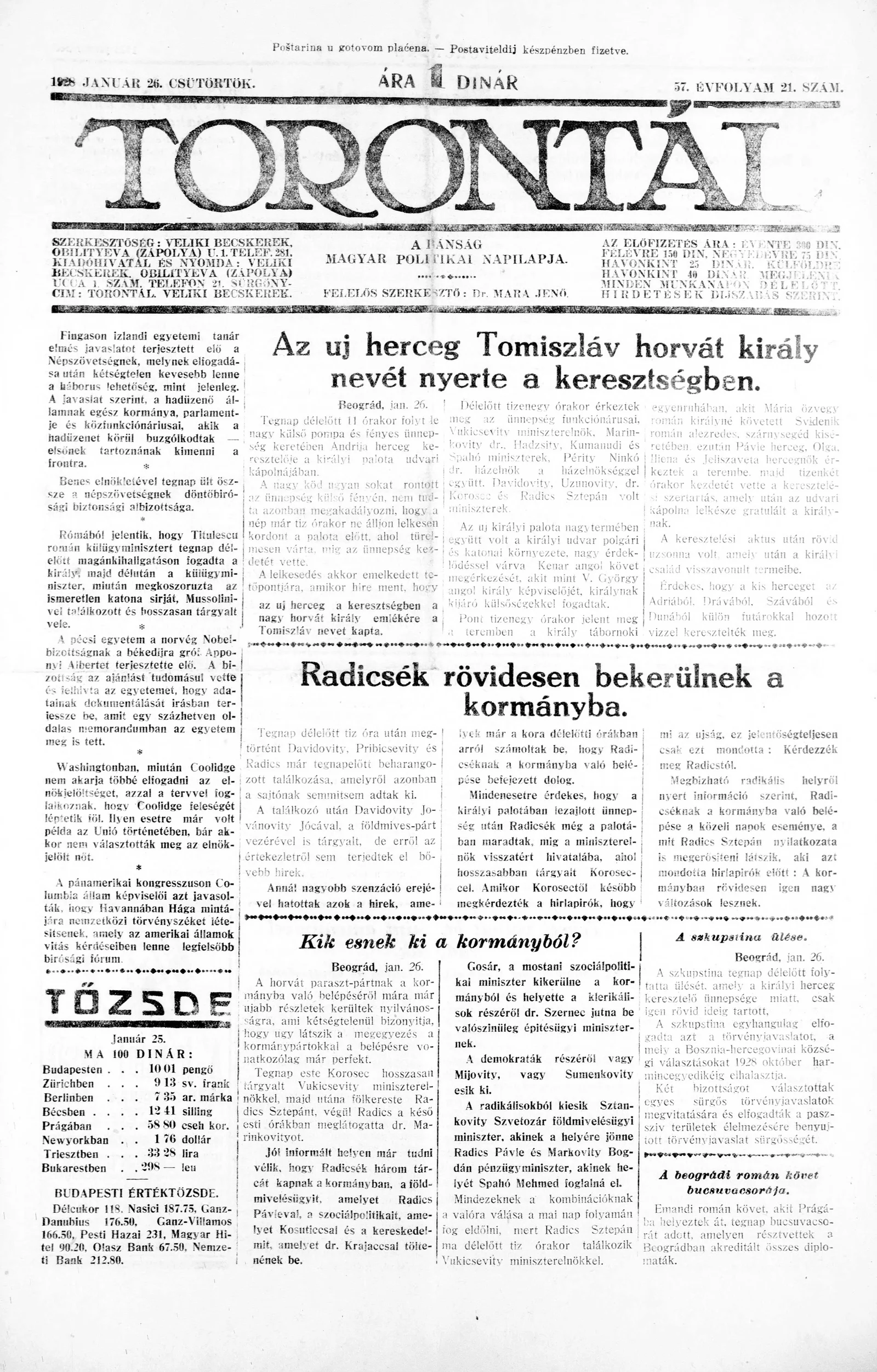 Torontál, 57. évf. 1928. január 26. 21. sz.