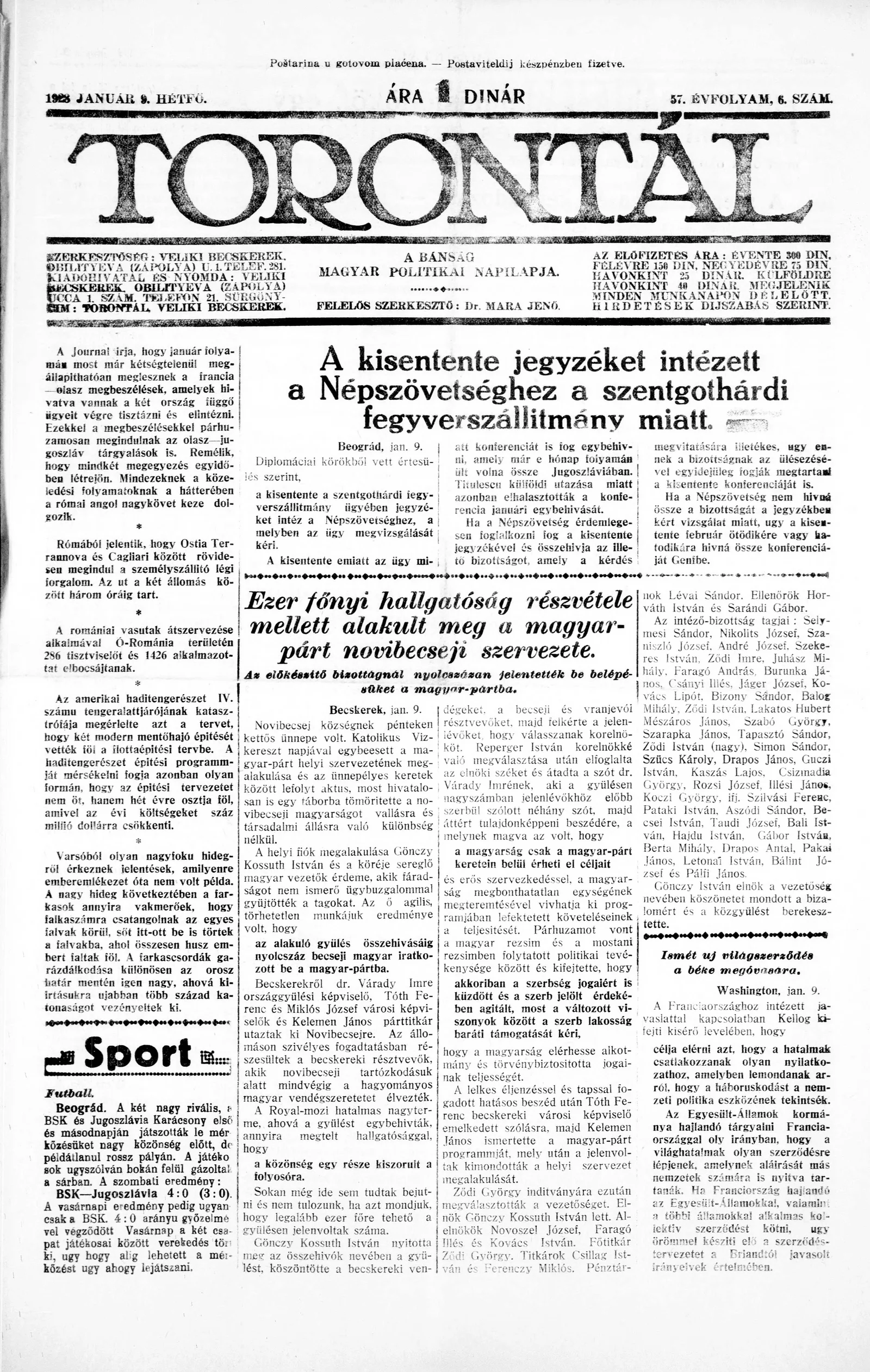 Torontál, 57. évf. 1928. január 9. 6. sz.